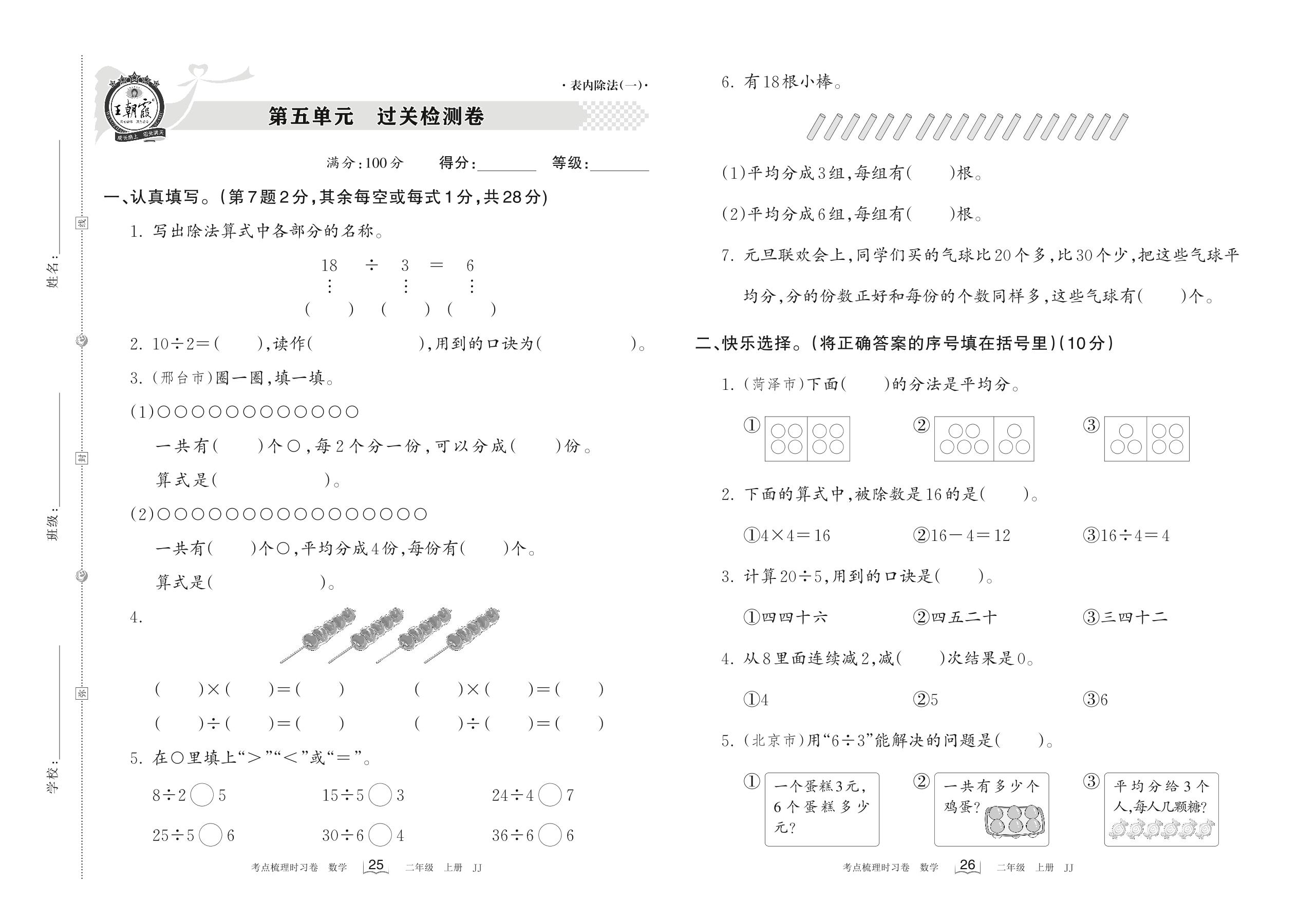 2022上册二年级数学冀教版 第五单元 过关检测卷