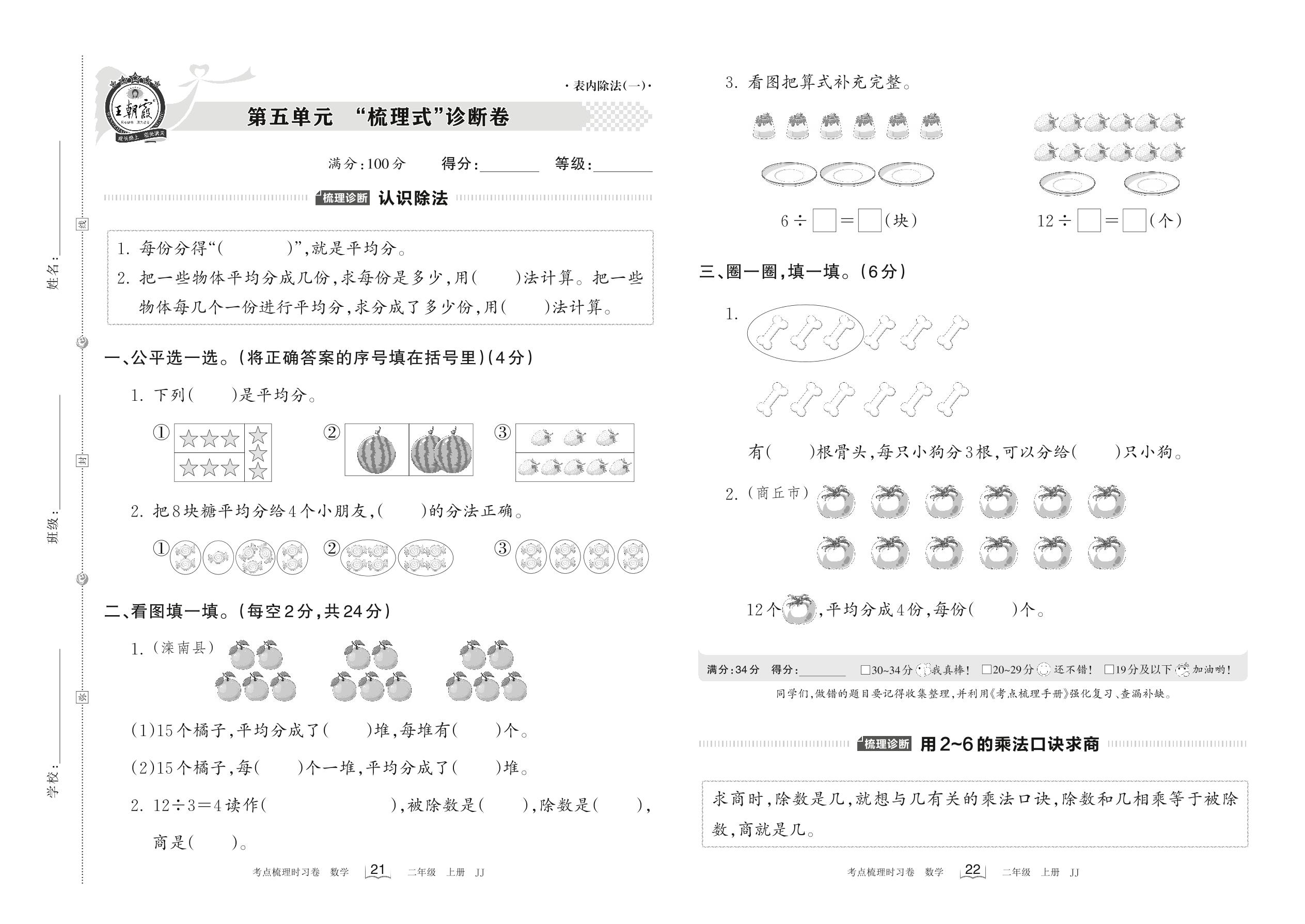 2022上册二年级数学冀教版 第五单元 “梳理式”诊断卷