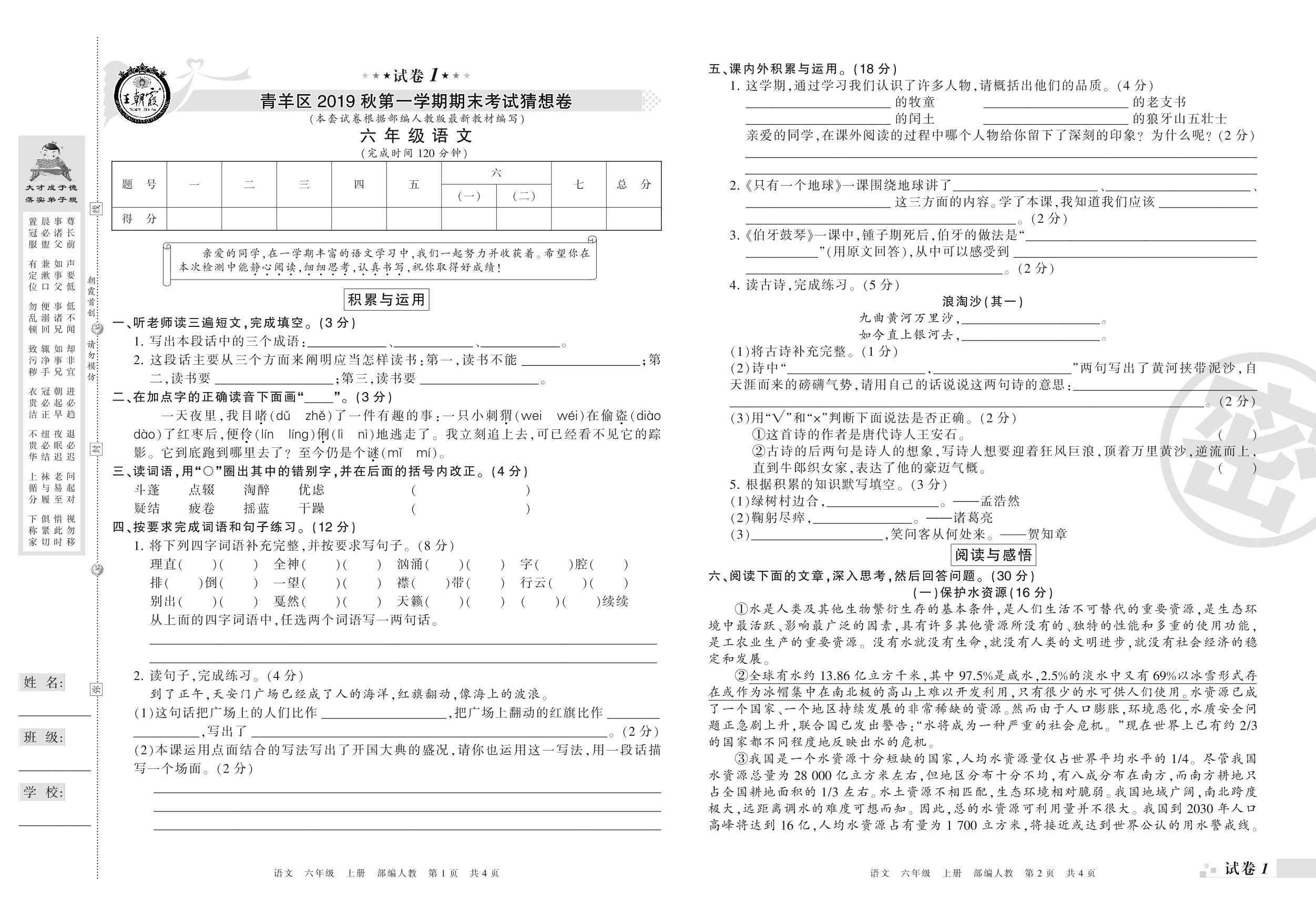2019-2020学年第一学期成都市青羊区猜想卷六年级语文试卷(人教版)【1】