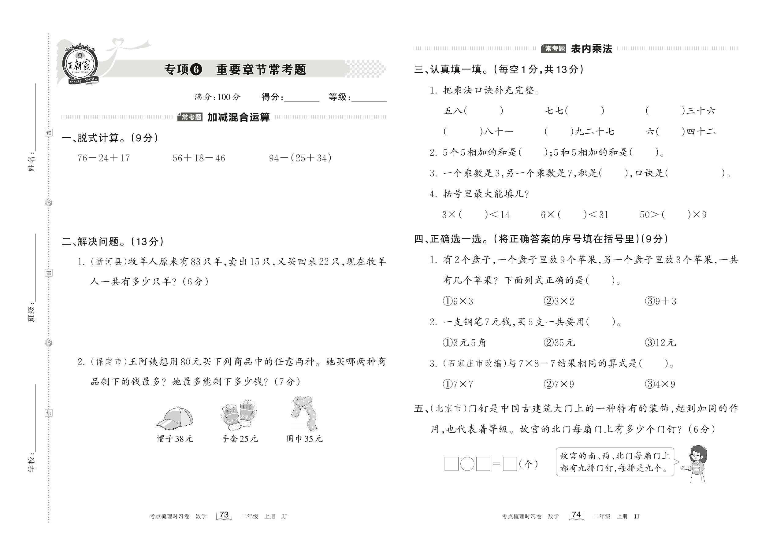 2022上册二年级数学冀教版 专项6 重要章节常考题