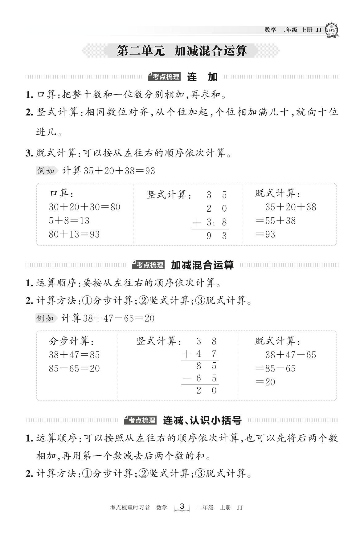 2022上册二年级数学冀教版 考点梳理手册——第二单元 加减混合运算