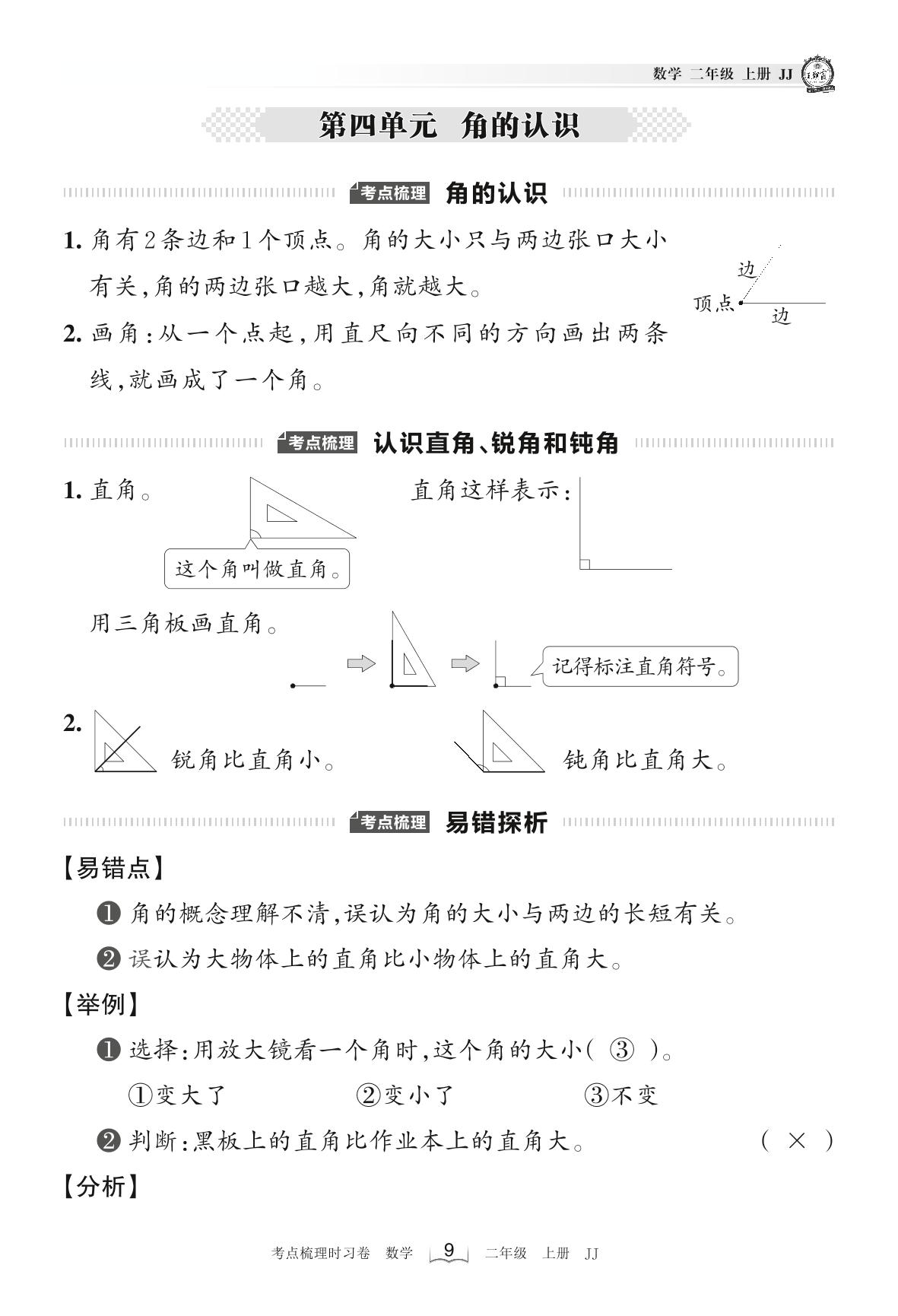 2022上册二年级数学冀教版 考点梳理手册——第四单元 角的认识