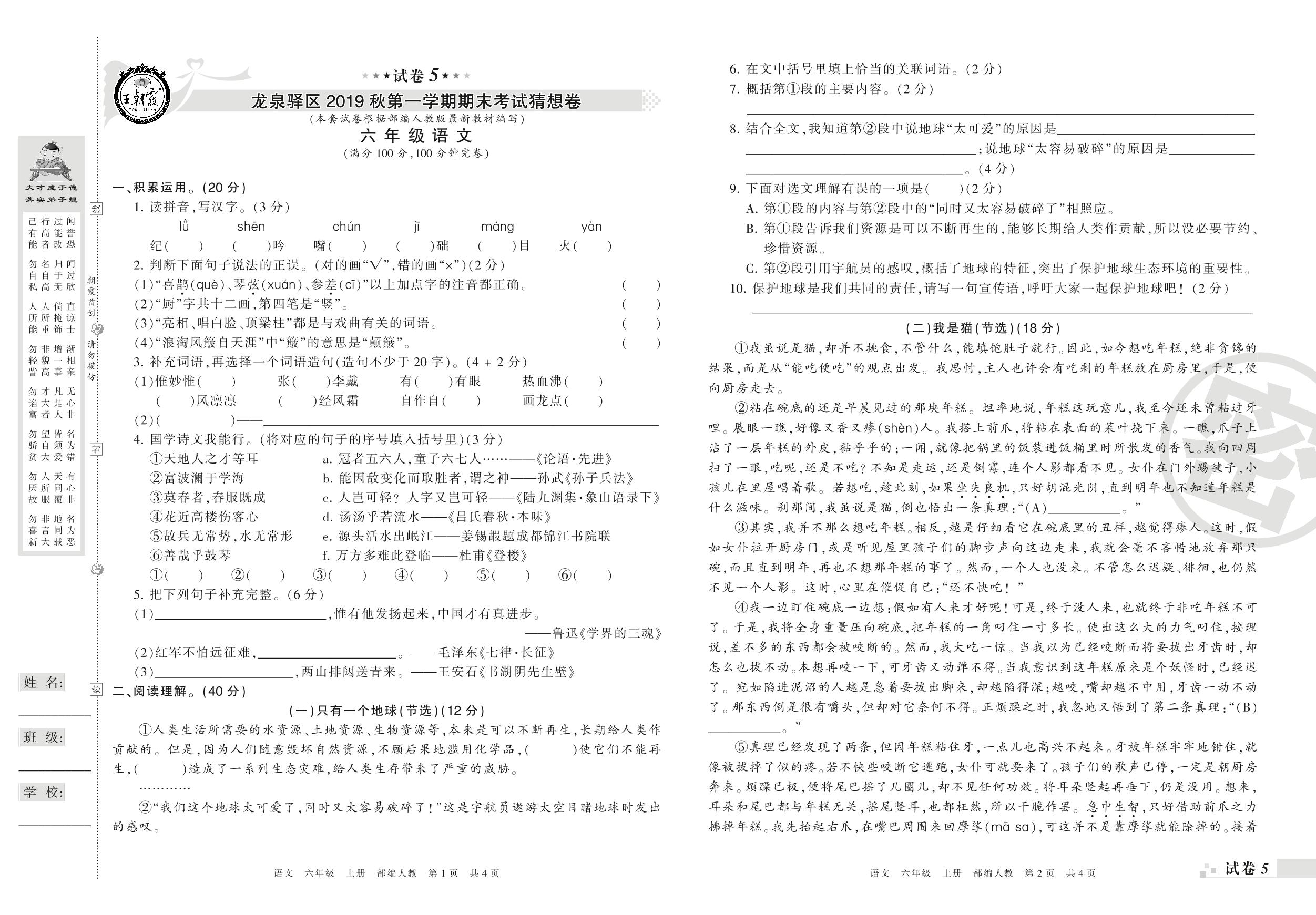 2019-2020学年第一学期成都市龙泉驿区猜想卷六年级语文试卷(人教版)【5】