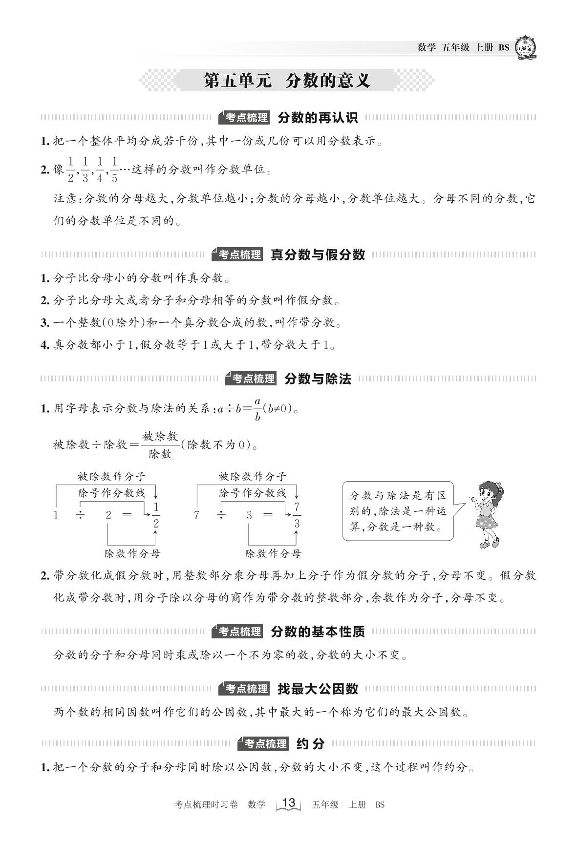 2022上册五年级数学北师版 考点梳理手册——第五单元 分数的意义