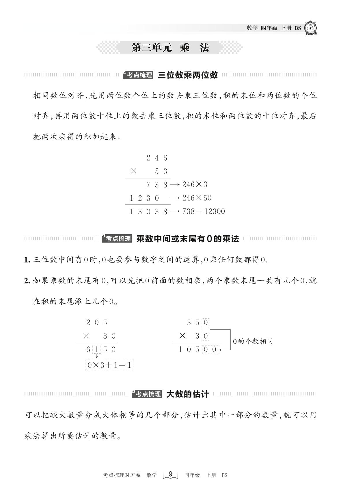 2022上册四年级数学北师版 考点梳理手册——第三单元 乘法
