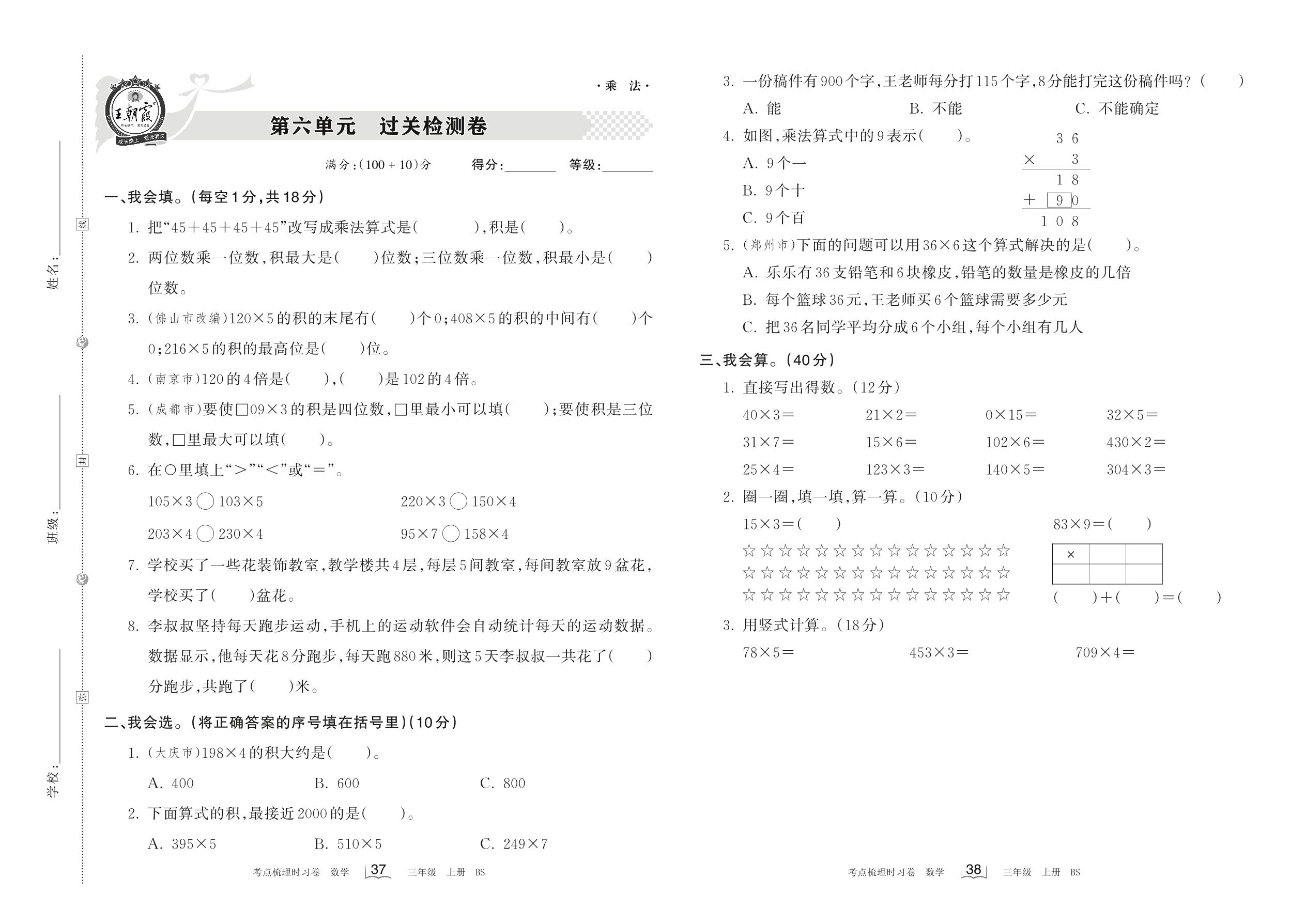 2022上册三年级数学北师版 第六单元 过关检测卷
