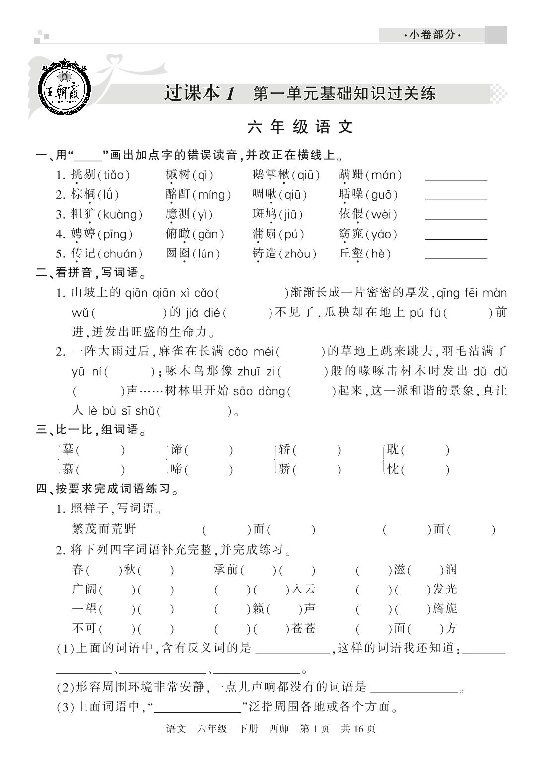 王朝霞期末小卷六年级下册语文(西师版)_R21080242122【0】