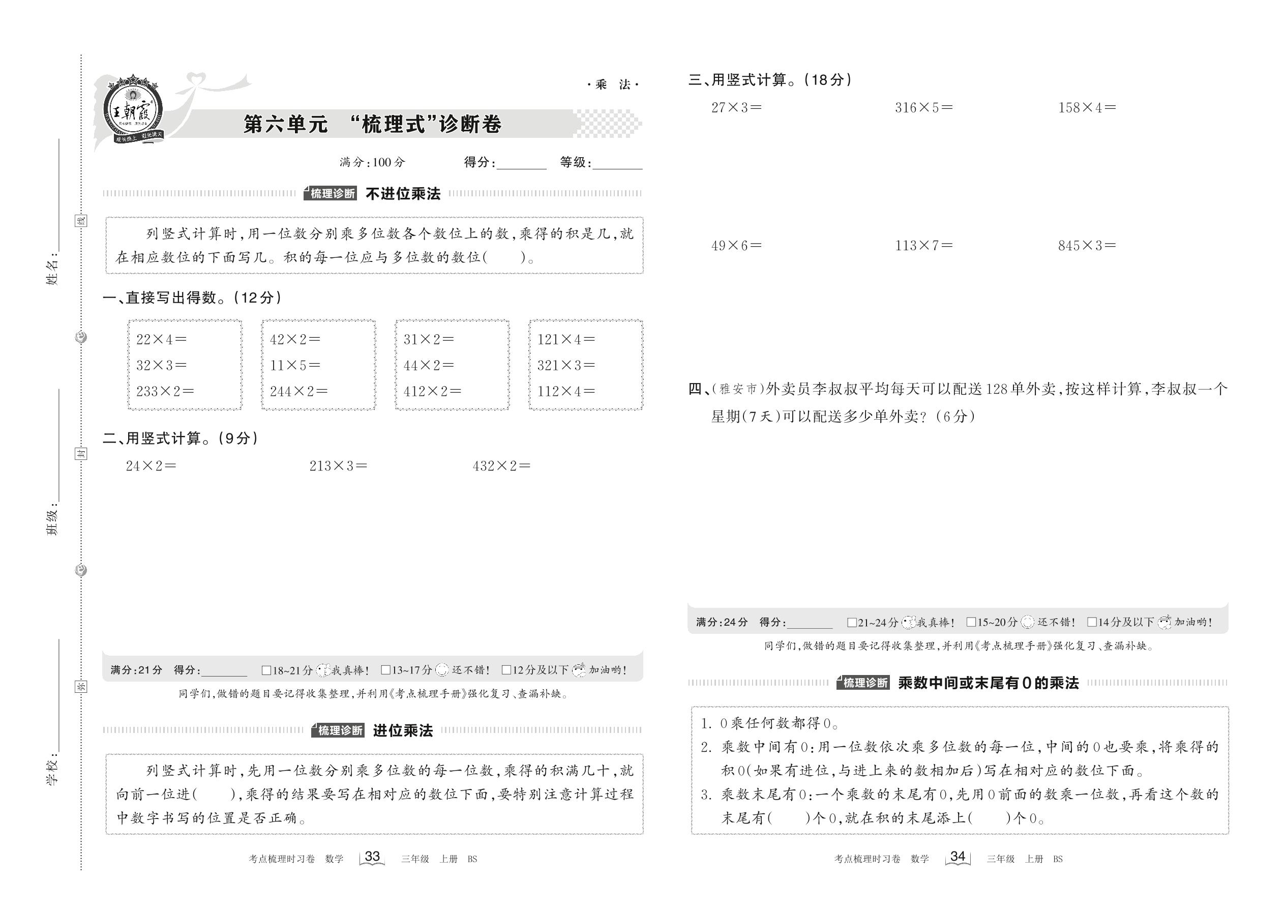 2022上册三年级数学北师版 第六单元 “梳理式”诊断卷