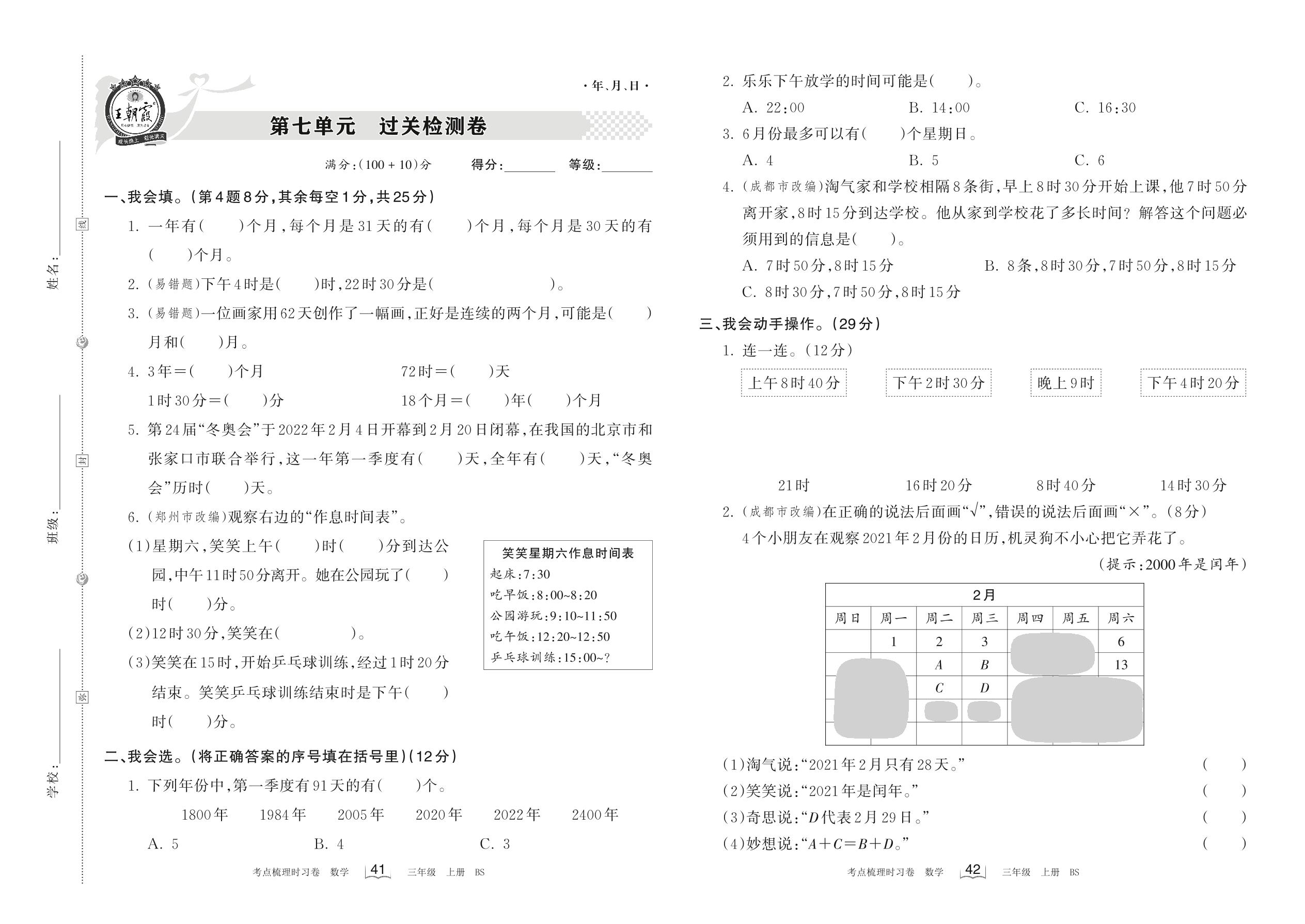 2022上册三年级数学北师版 第七单元 过关检测卷