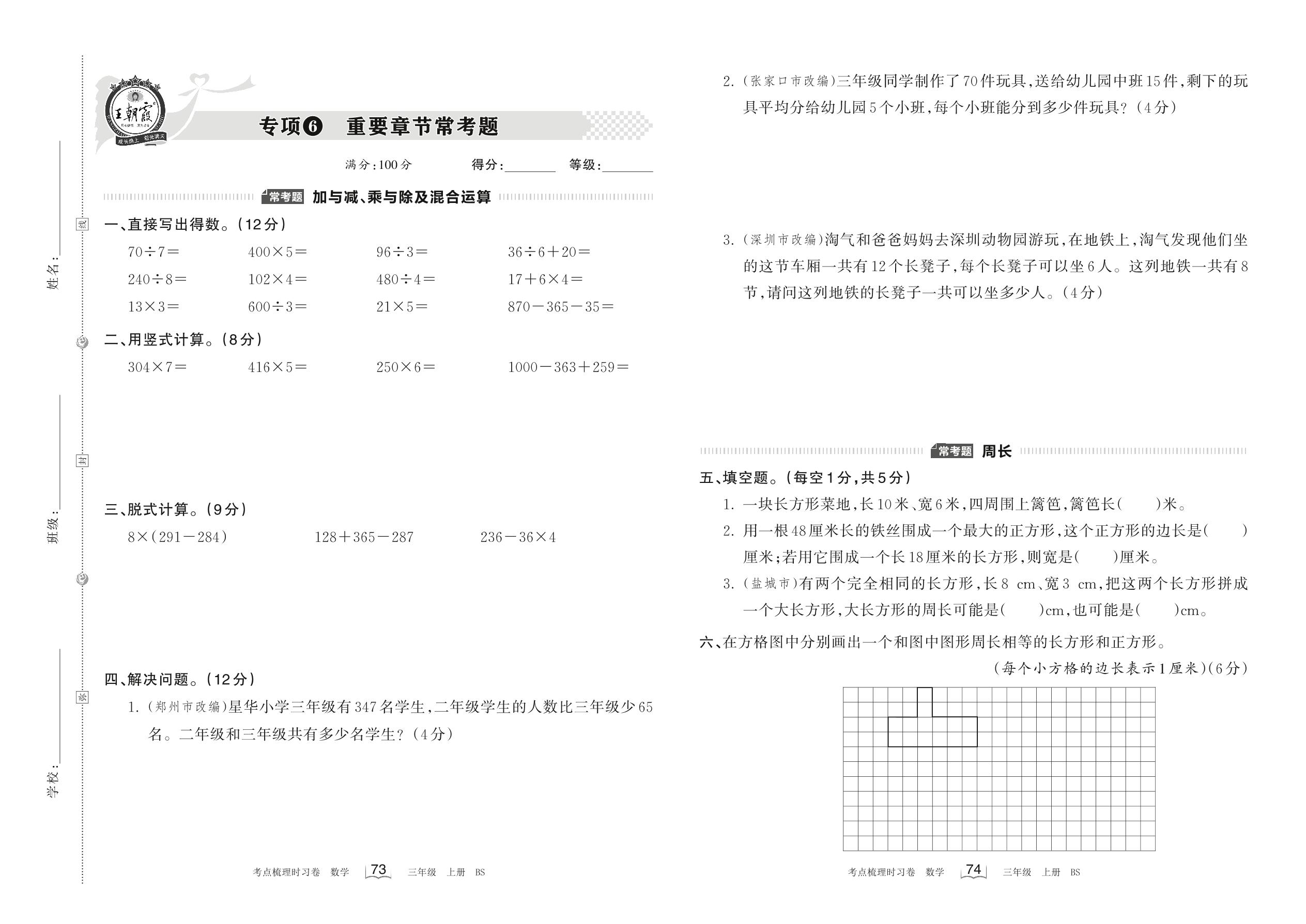 2022上册三年级数学北师版 专项6 重要章节常考题