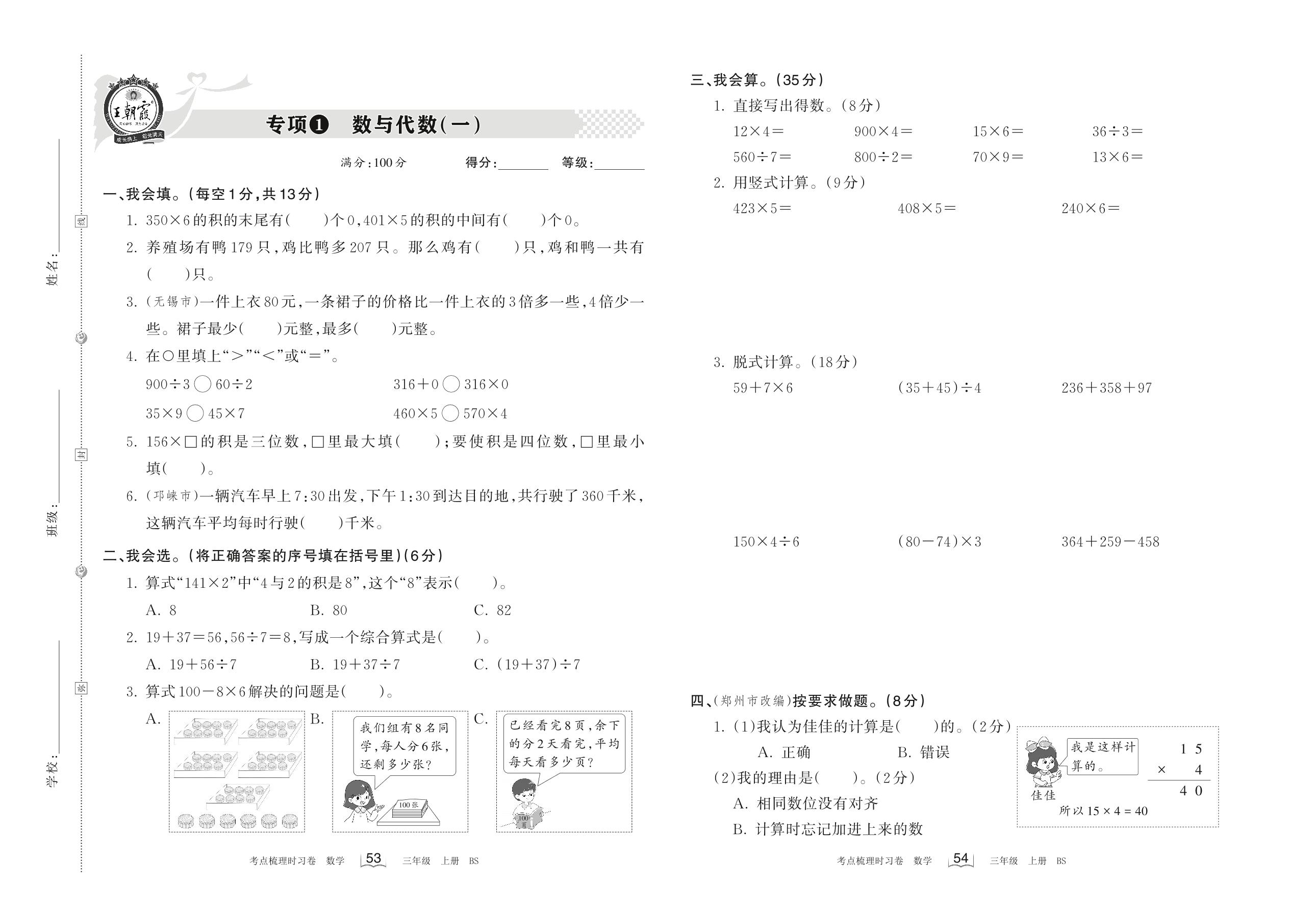 2022上册三年级数学北师版 专项1 数与代数(一)