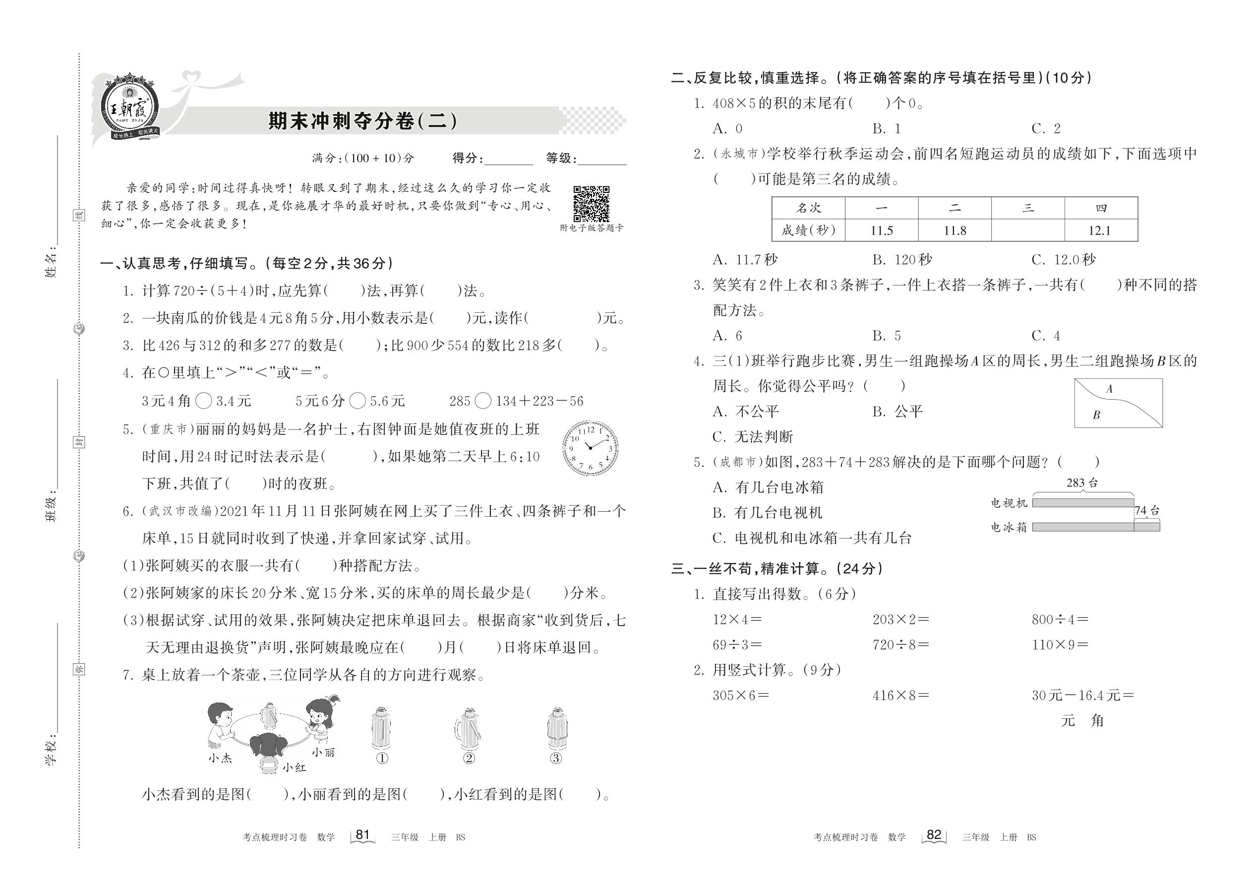 2022上册三年级数学北师版 期末冲刺夺分卷(二)