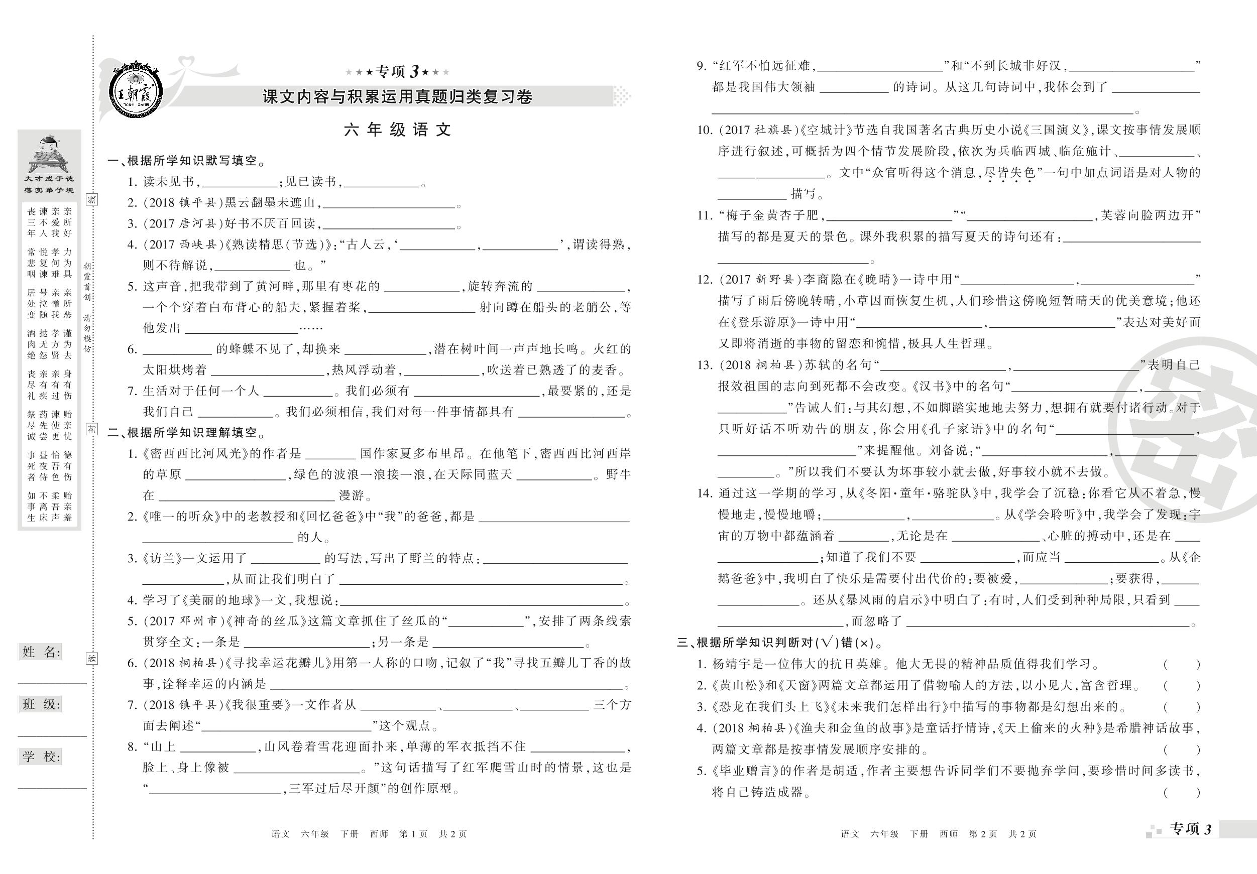 王朝霞期末专项卷——课文内容与积累运用、课内阅读与写作真题归类复习卷六年级下册语文(西师版)_R21080242134【0】