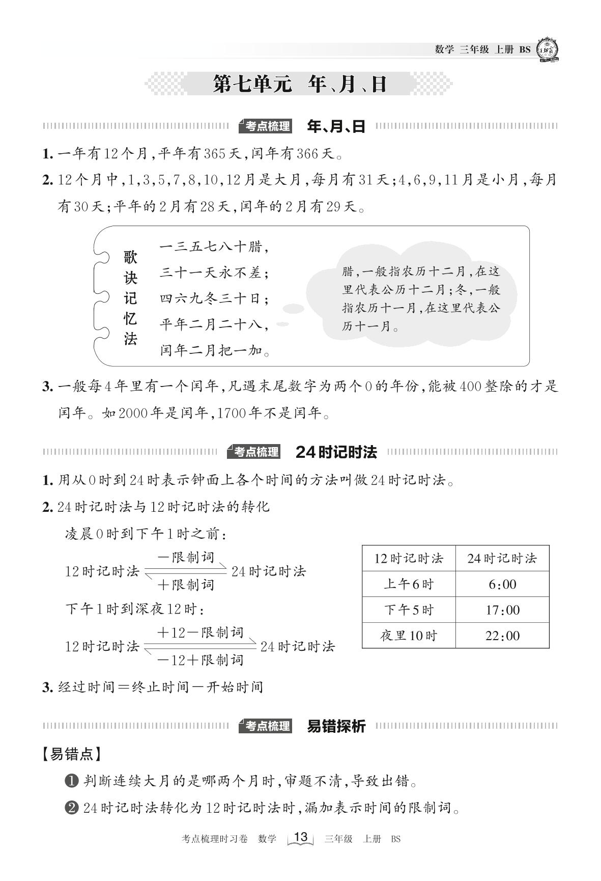2022上册三年级数学北师版 考点梳理手册——第七单元 年、月、日