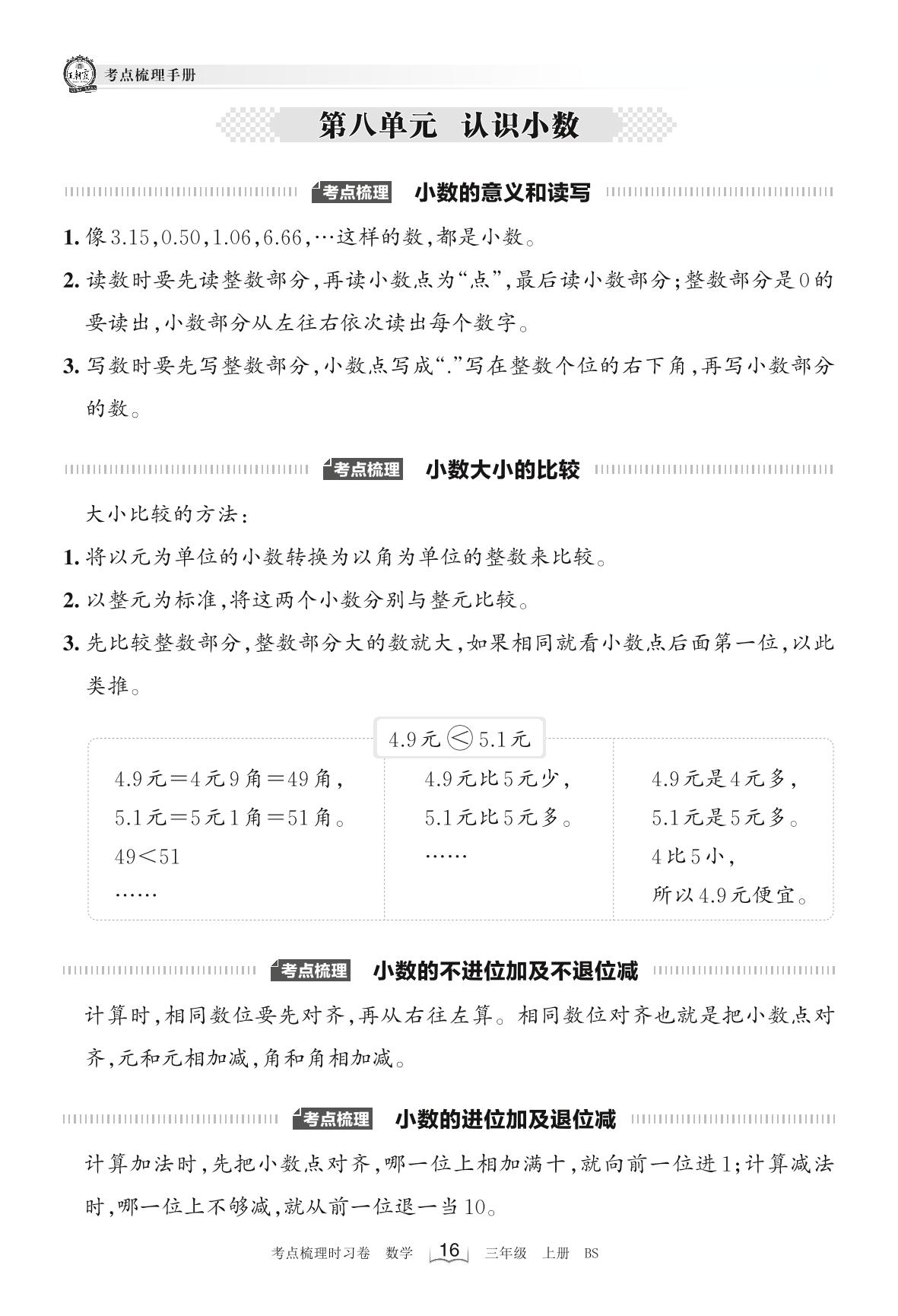 2022上册三年级数学北师版 考点梳理手册——第八单元 认识小数