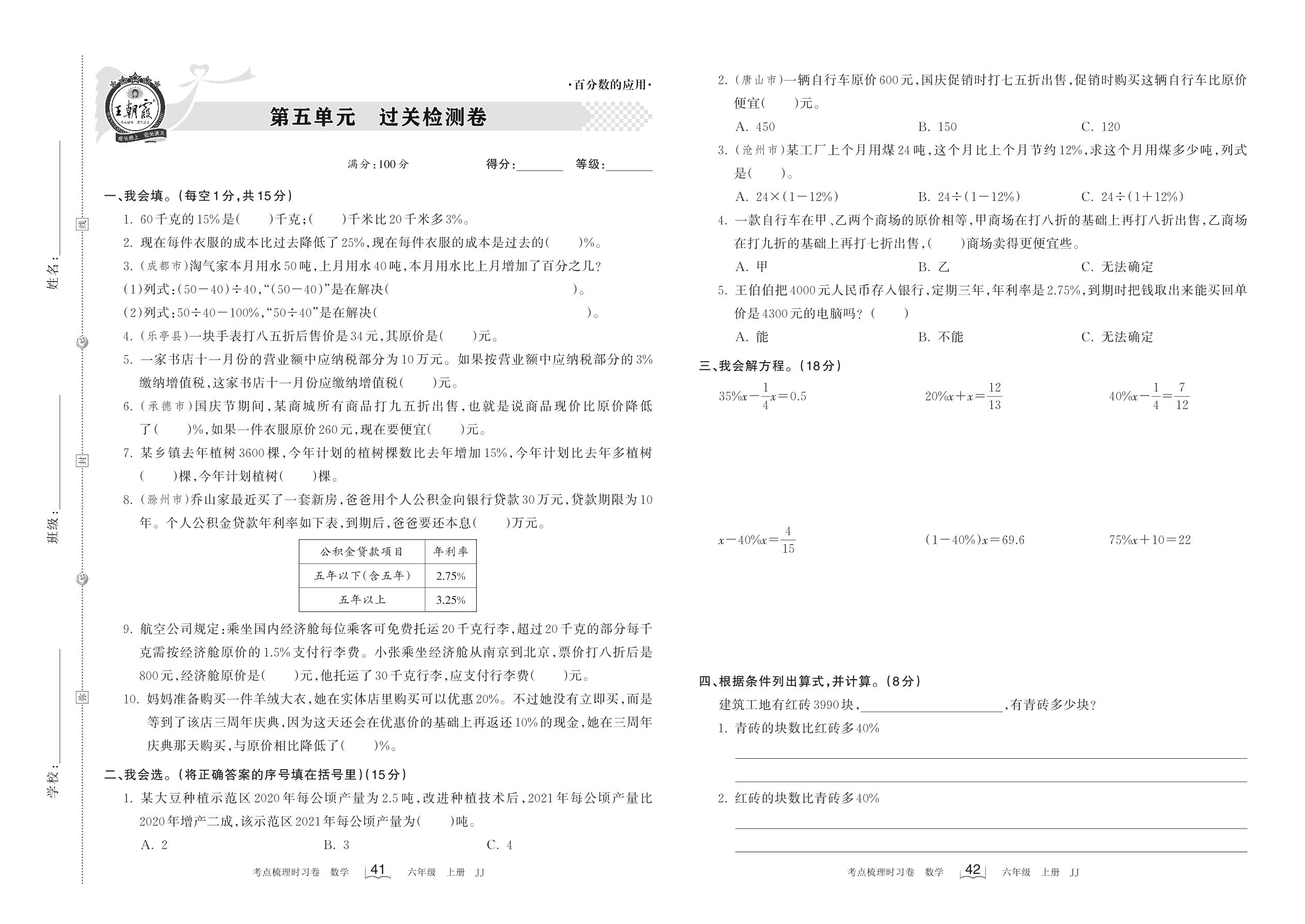 2022上册六年级数学冀教版 第五单元 过关检测卷