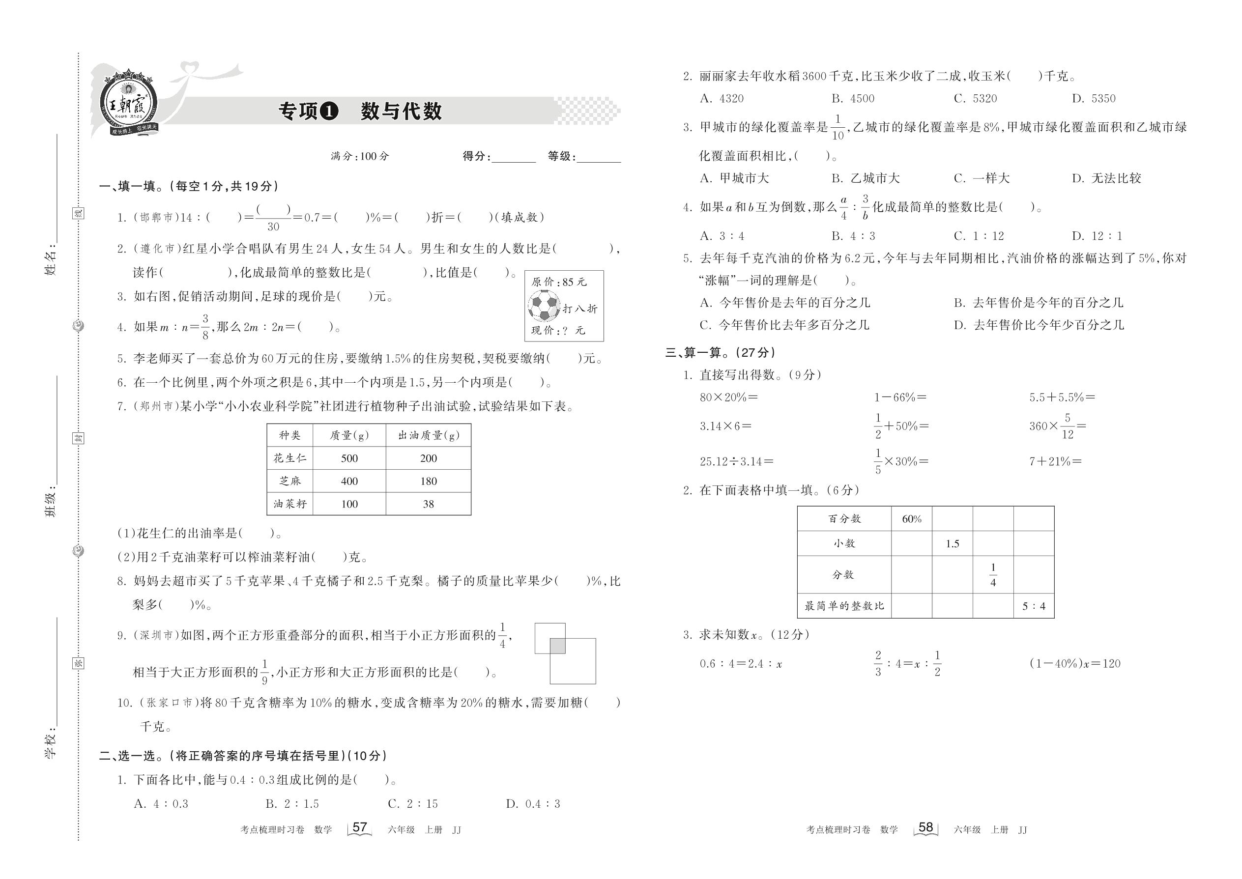 六年级数学冀教版上册专项卷