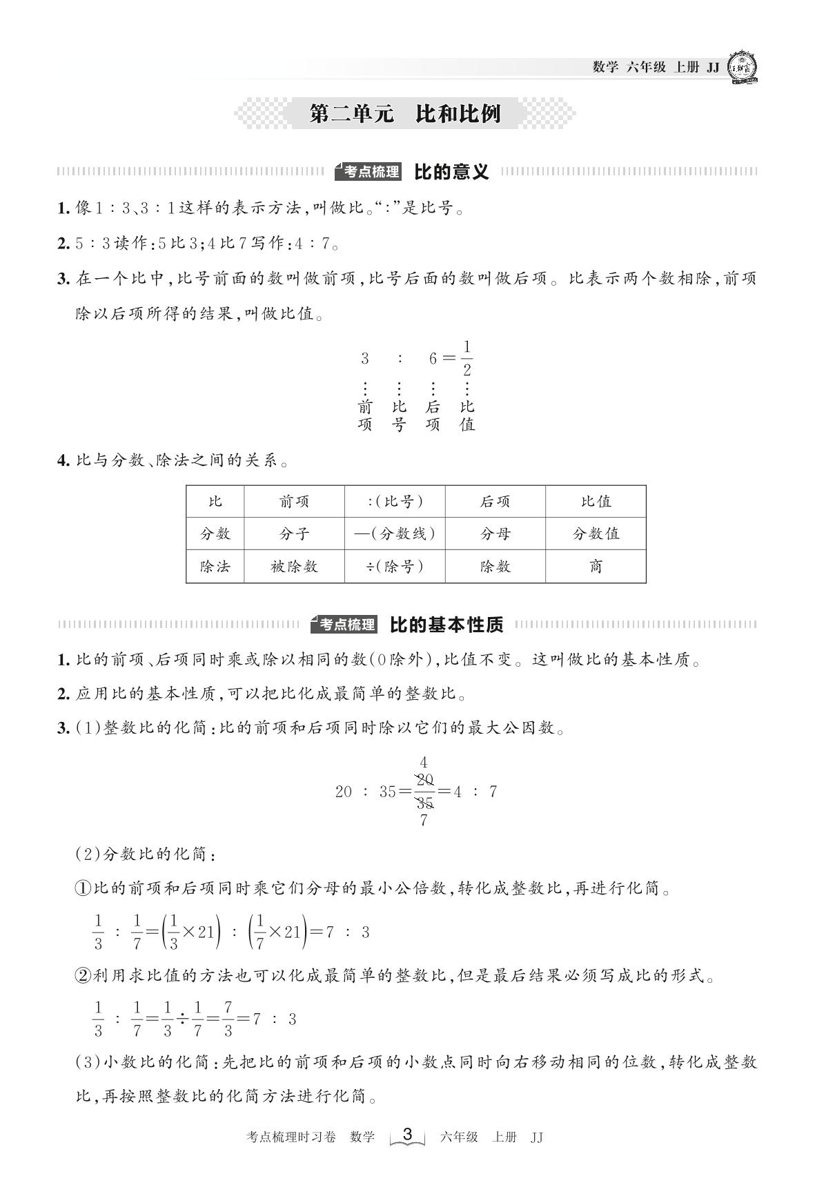 2022上册六年级数学冀教版 考点梳理手册——第二单元 比和比例