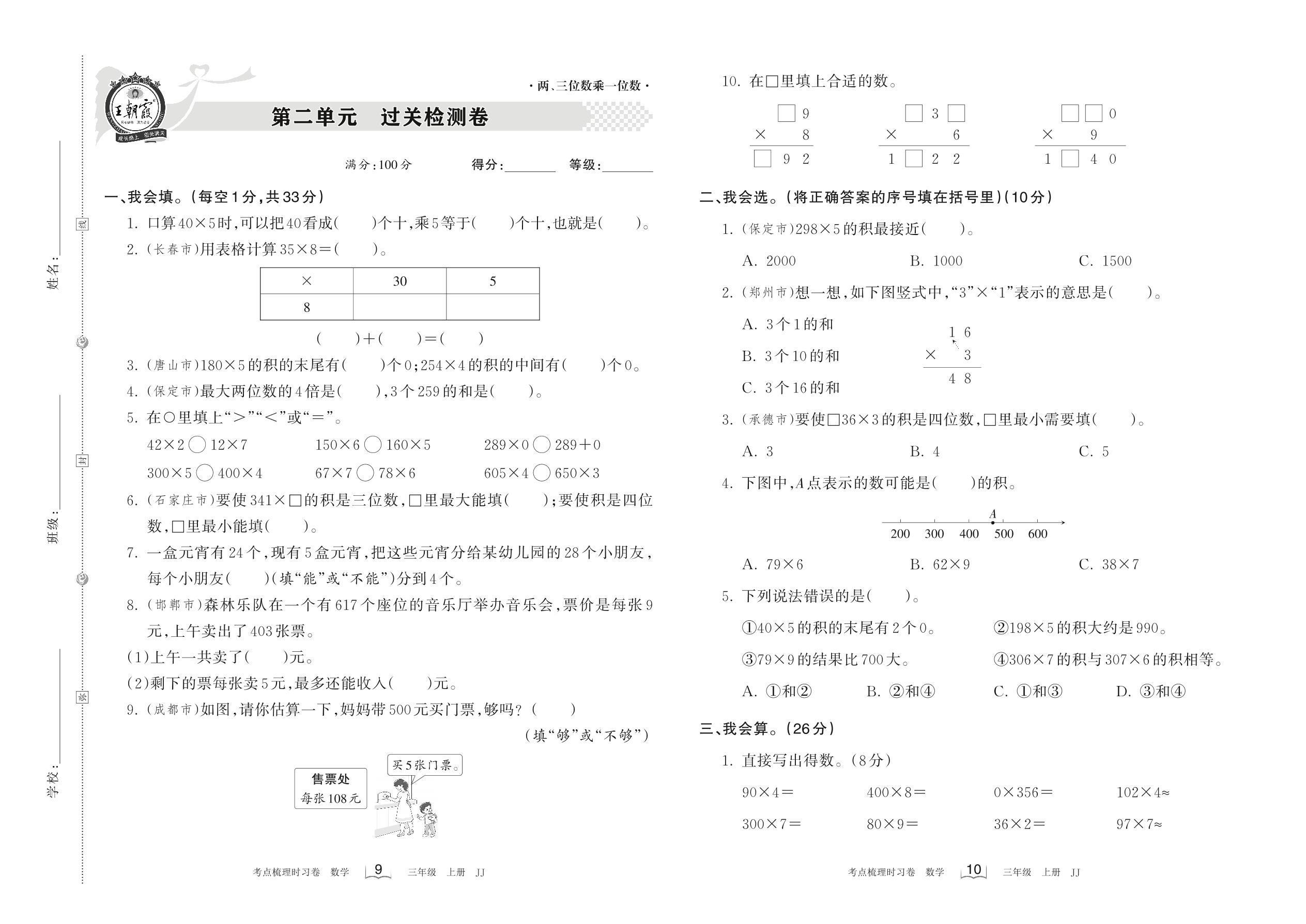 2022上册三年级数学冀教版 第二单元 过关检测卷
