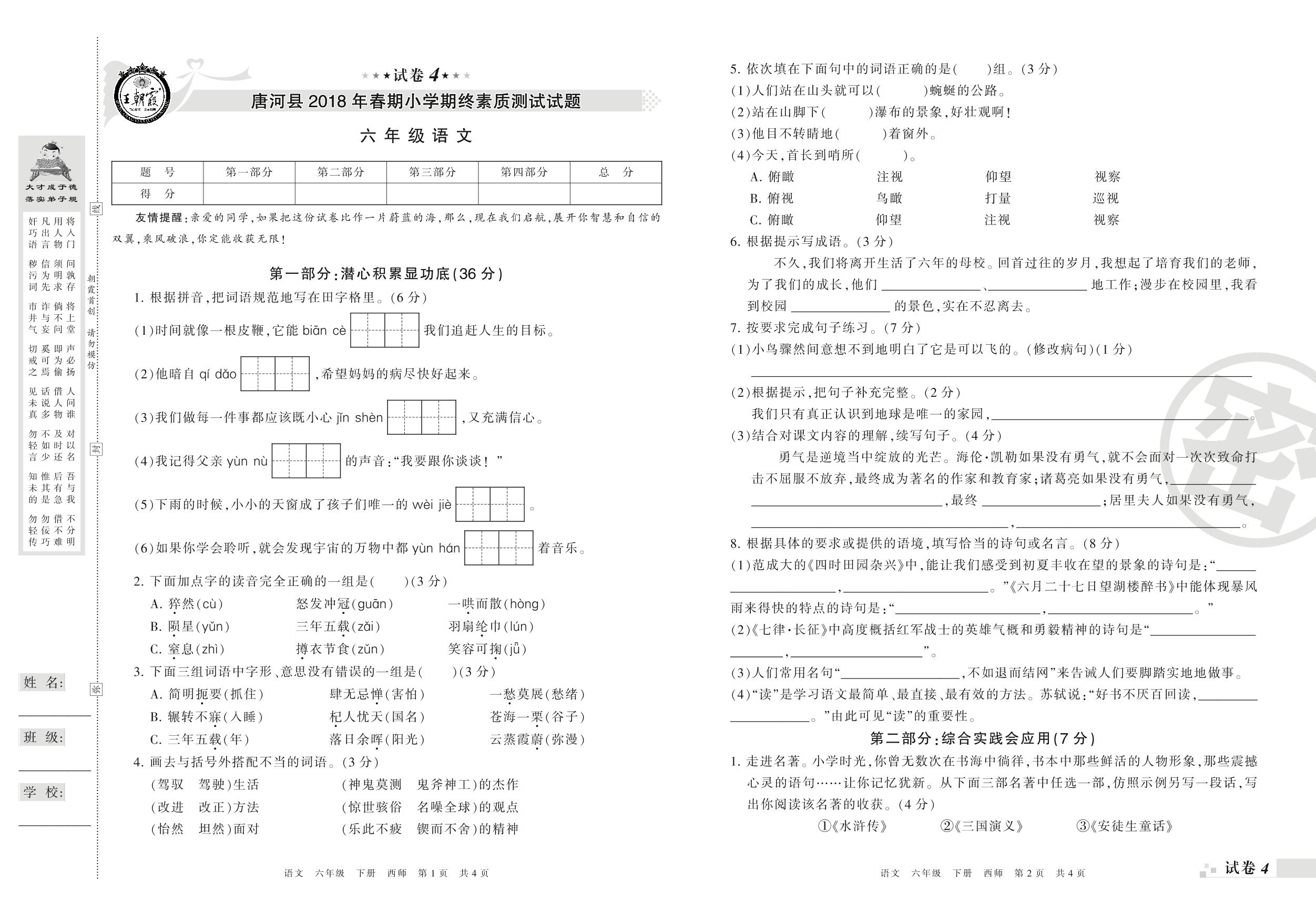 2017-2018学年第二学期南阳市唐河县六年级语文试卷(西师版)【4】