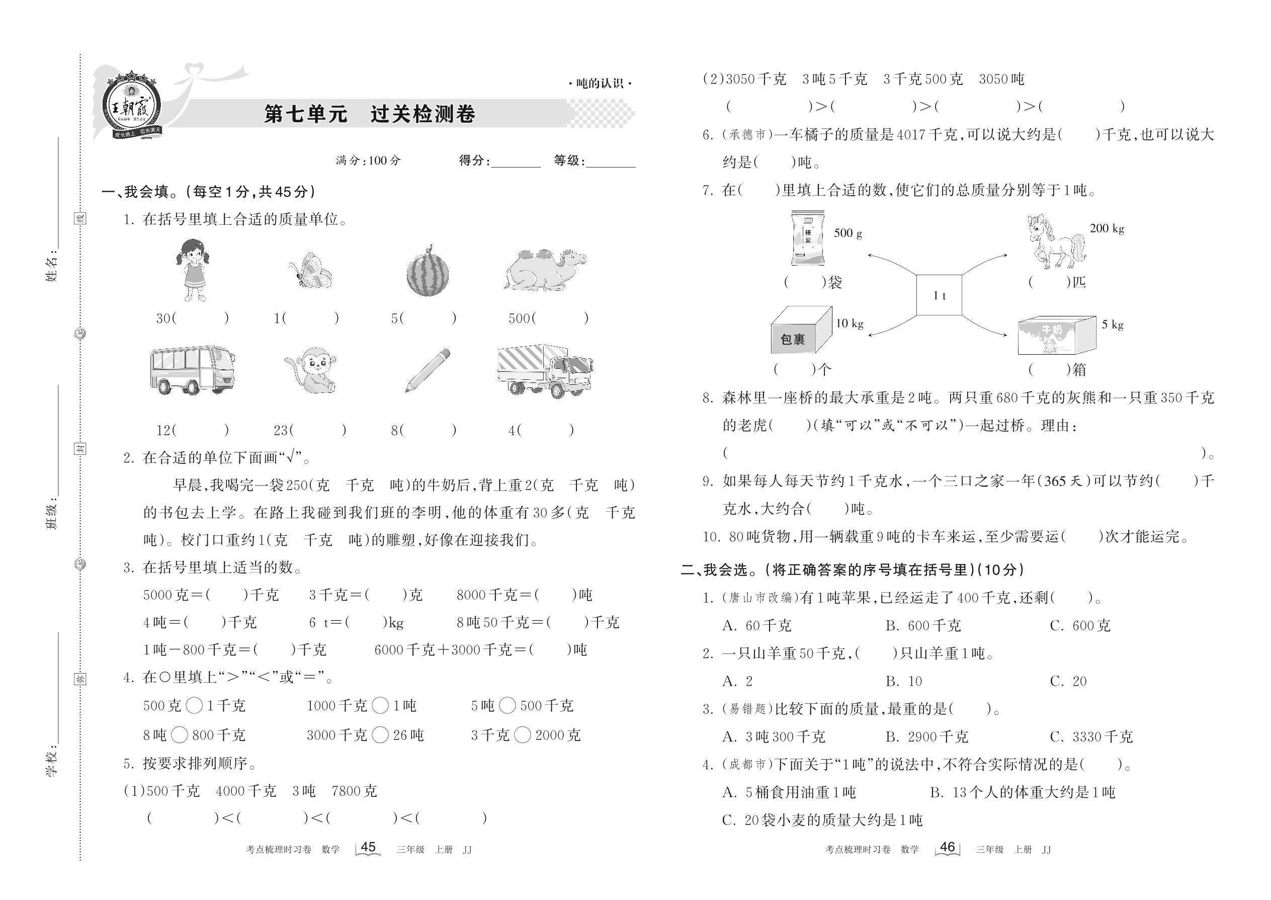 2022上册三年级数学冀教版 第七单元 过关检测卷