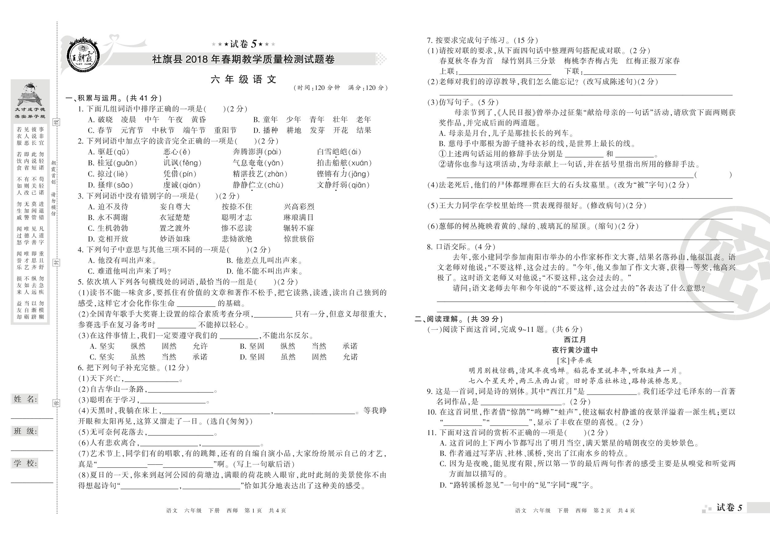 2017-2018学年第二学期南阳市社旗县六年级语文试卷(西师版)【5】