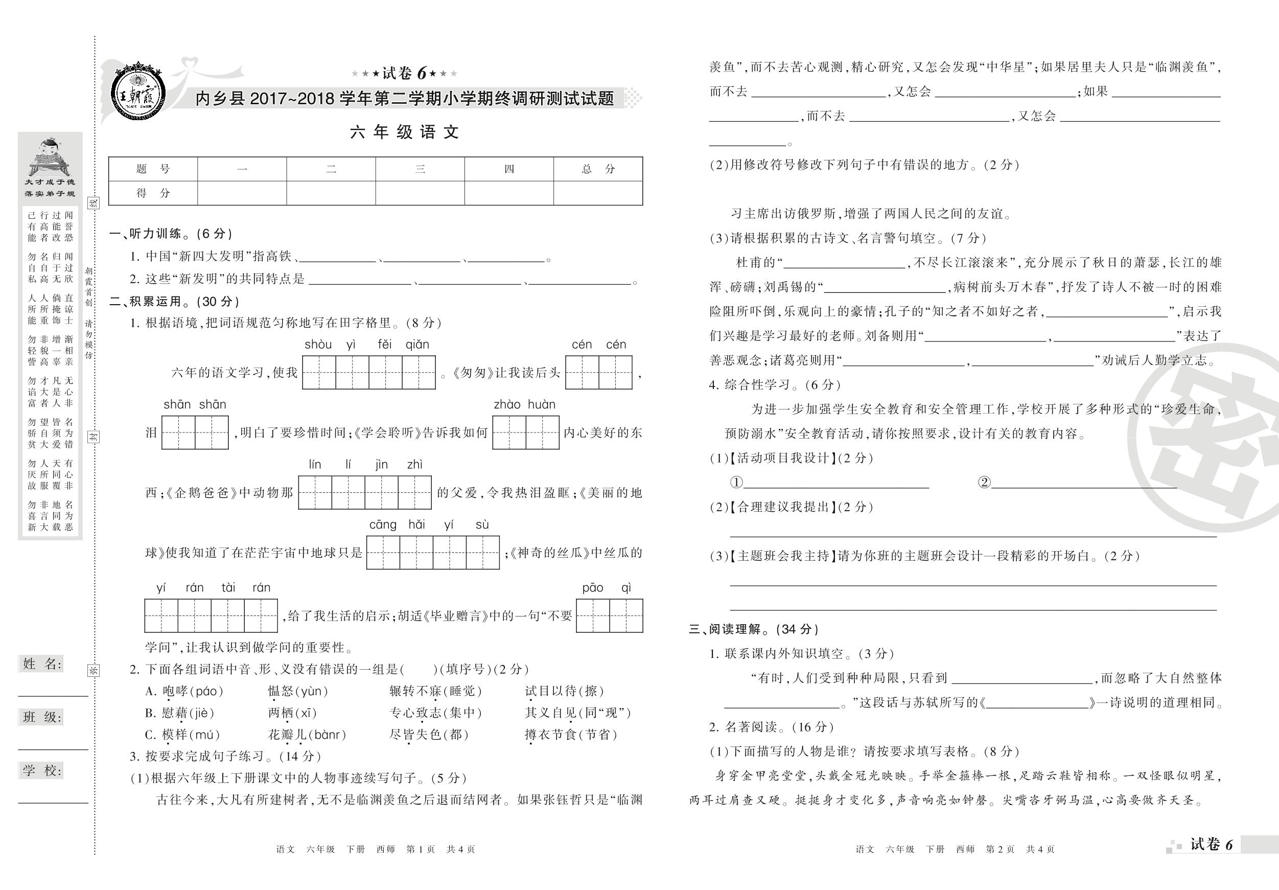2017-2018学年第二学期南阳市内乡县六年级语文试卷(西师版)【6】