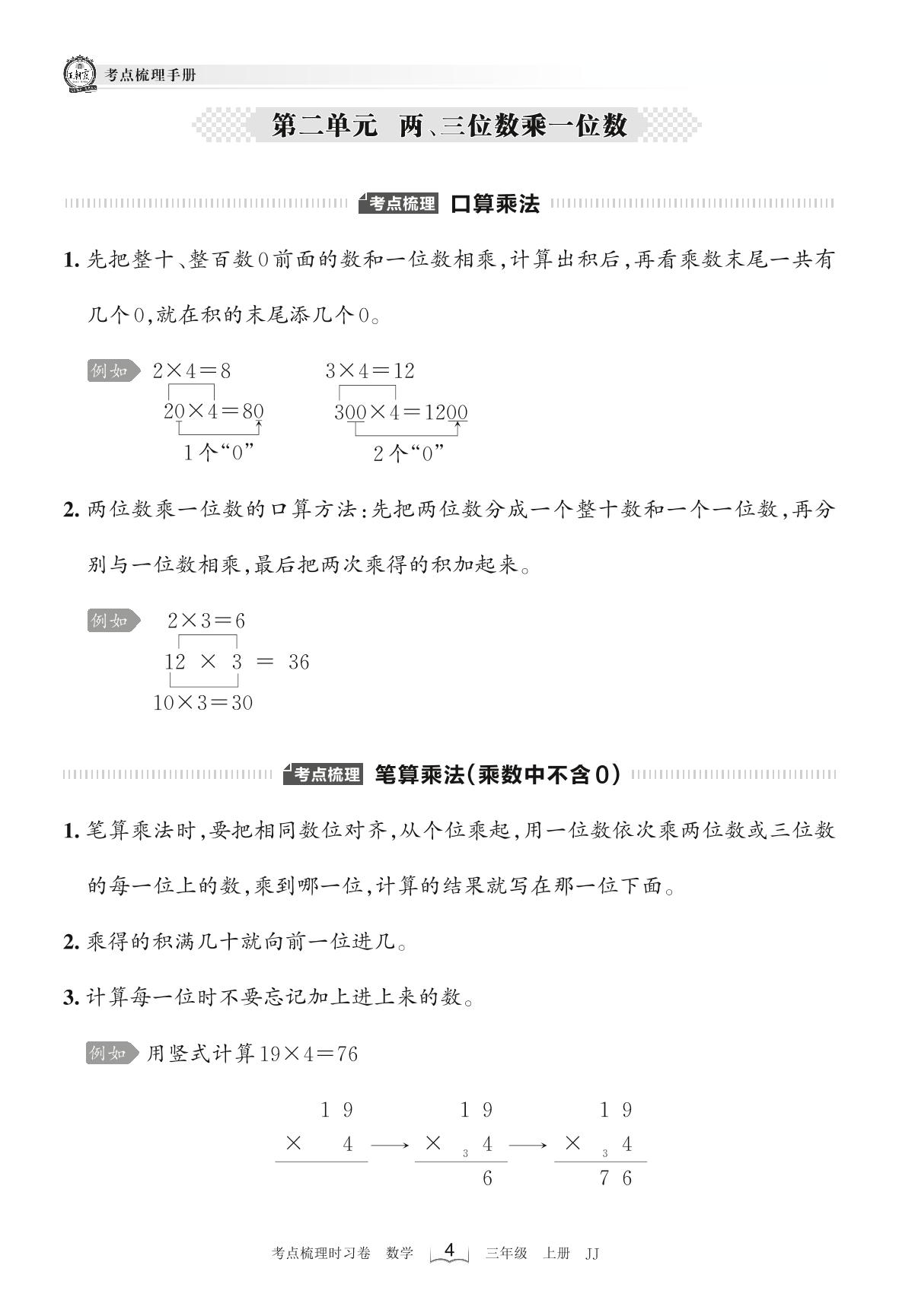 2022上册三年级数学冀教版 考点梳理手册——第二单元 两、三位数乘一位数
