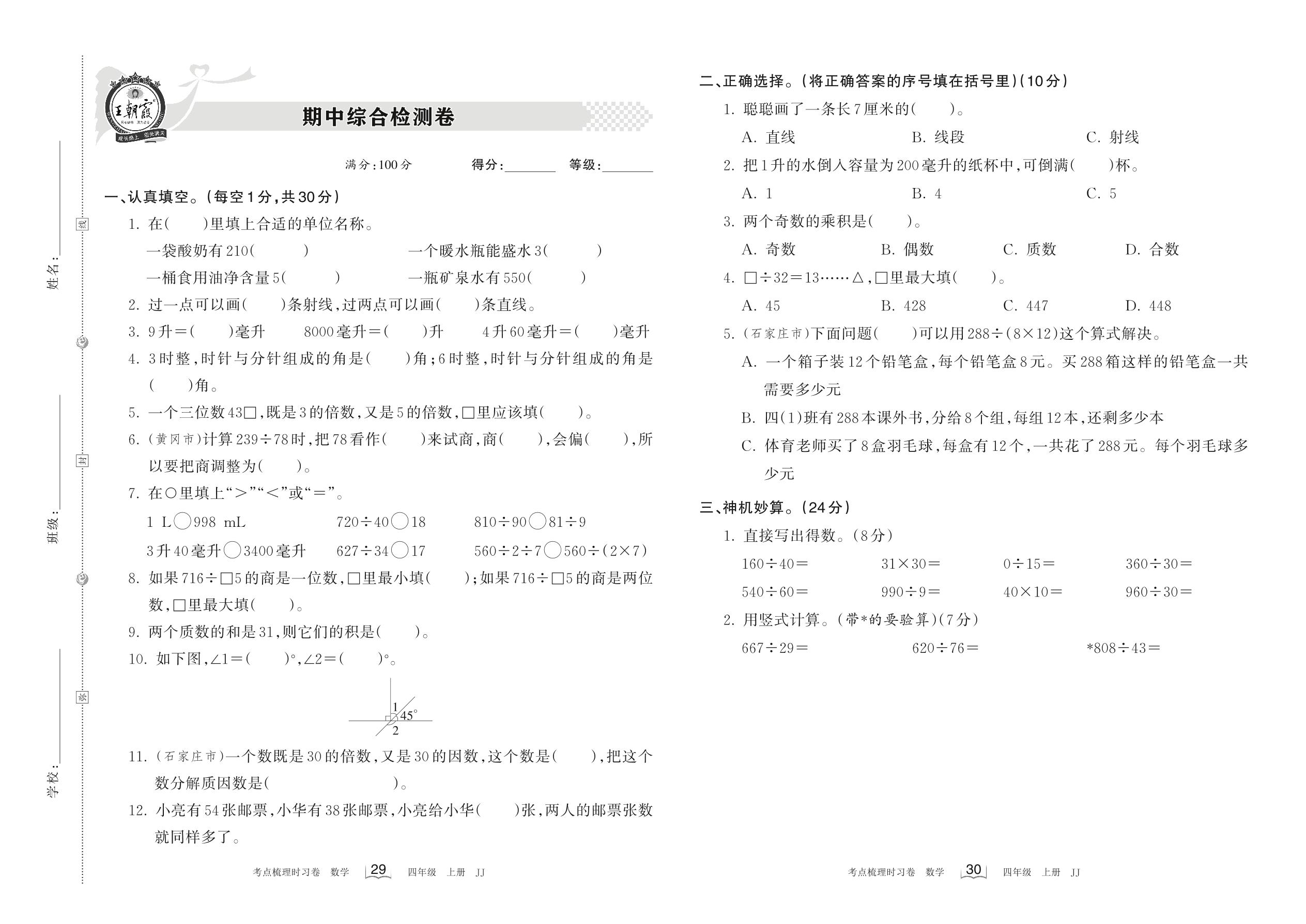 四年级数学冀教版上册期中卷