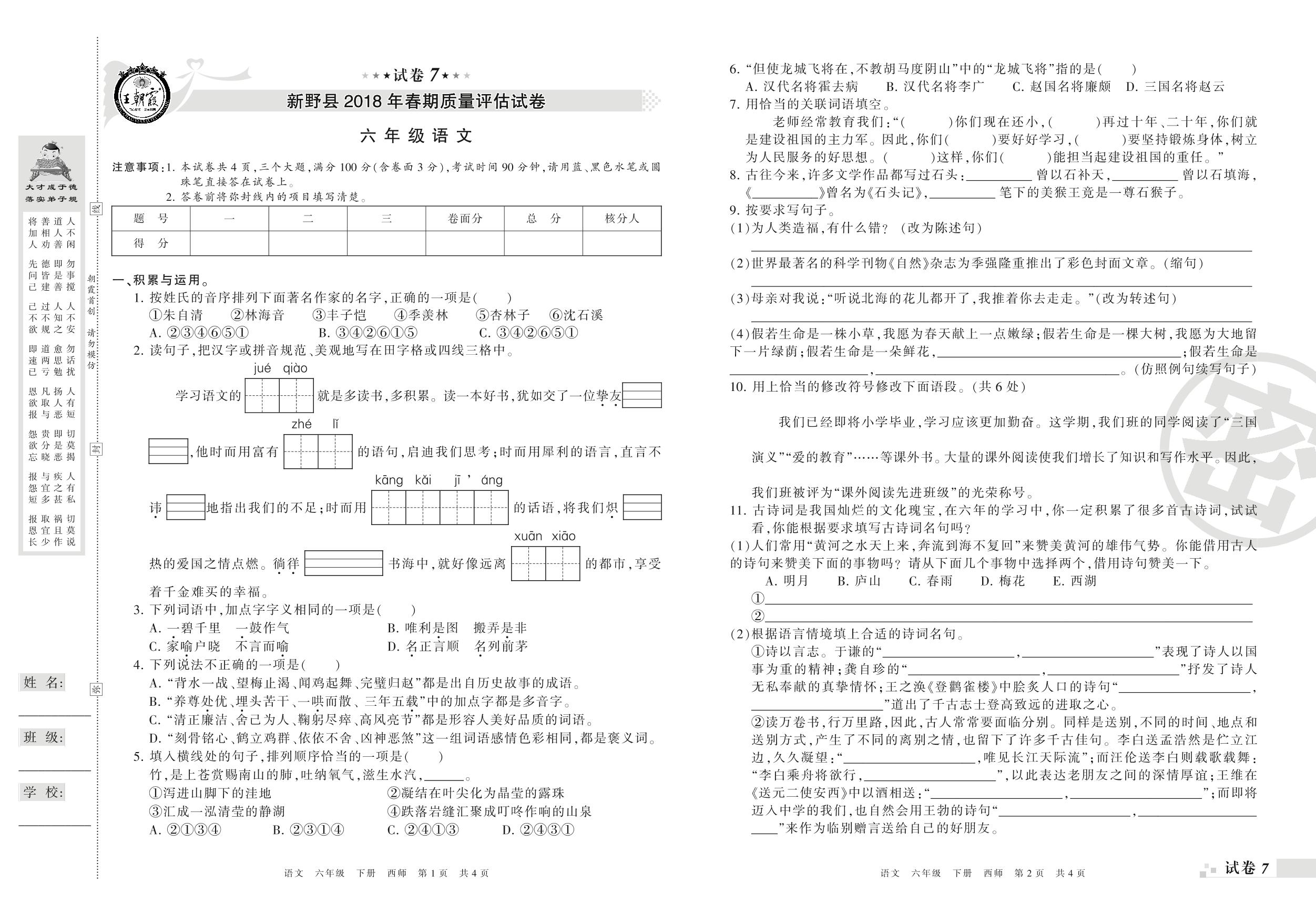 2017-2018学年第二学期南阳市新野县六年级语文试卷(西师版)【7】