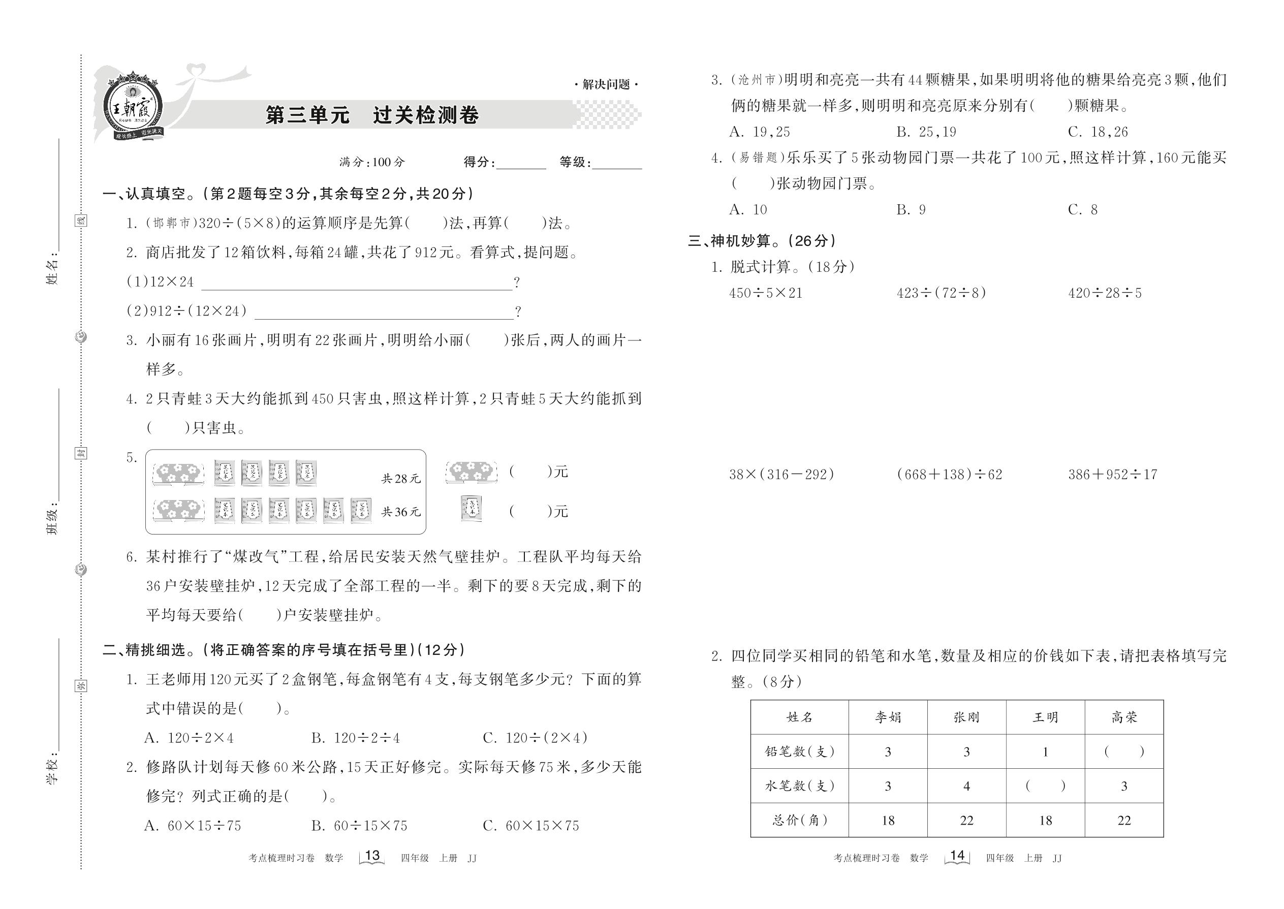 2022上册四年级数学冀教版 第三单元 过关检测卷