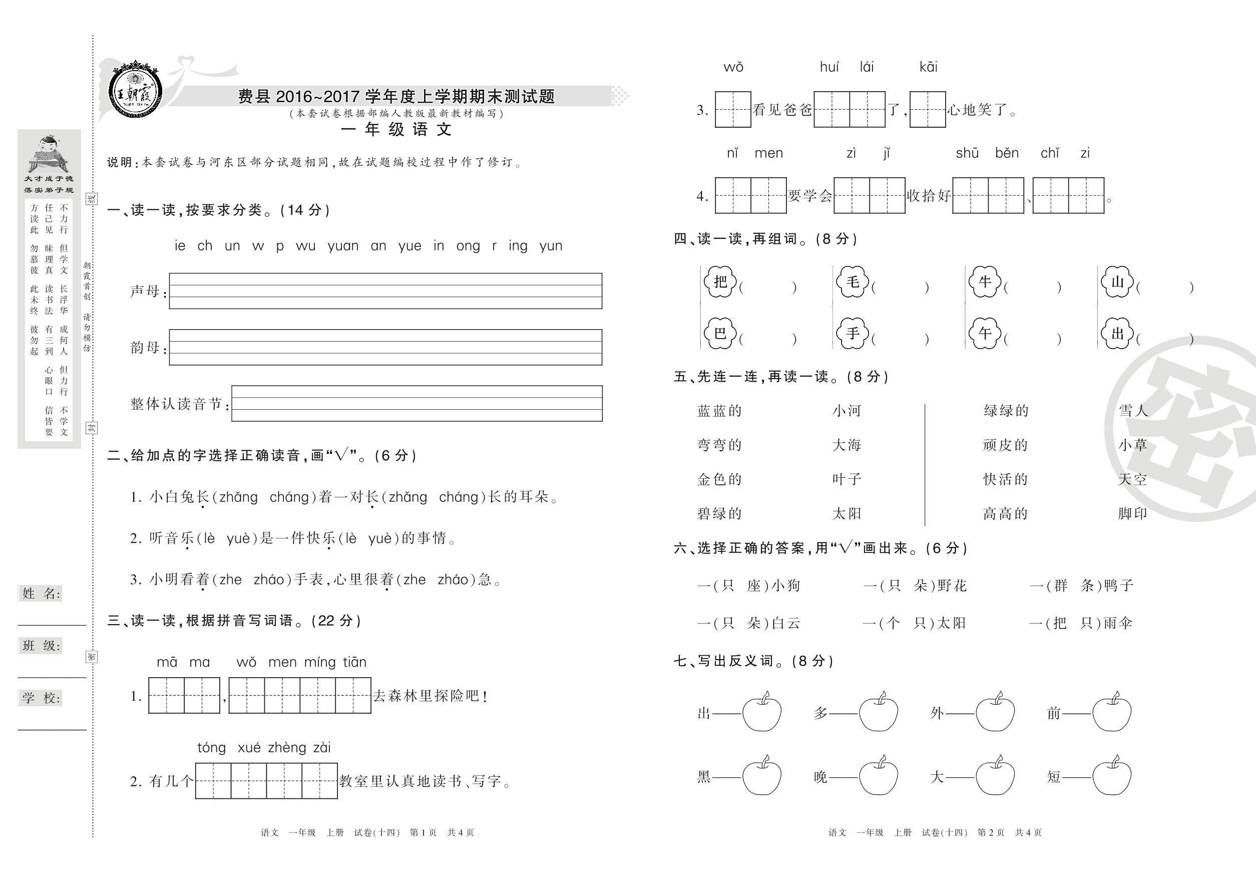 2016-2017学年第一学期临沂市费县一年级语文试卷(人教版)【14】