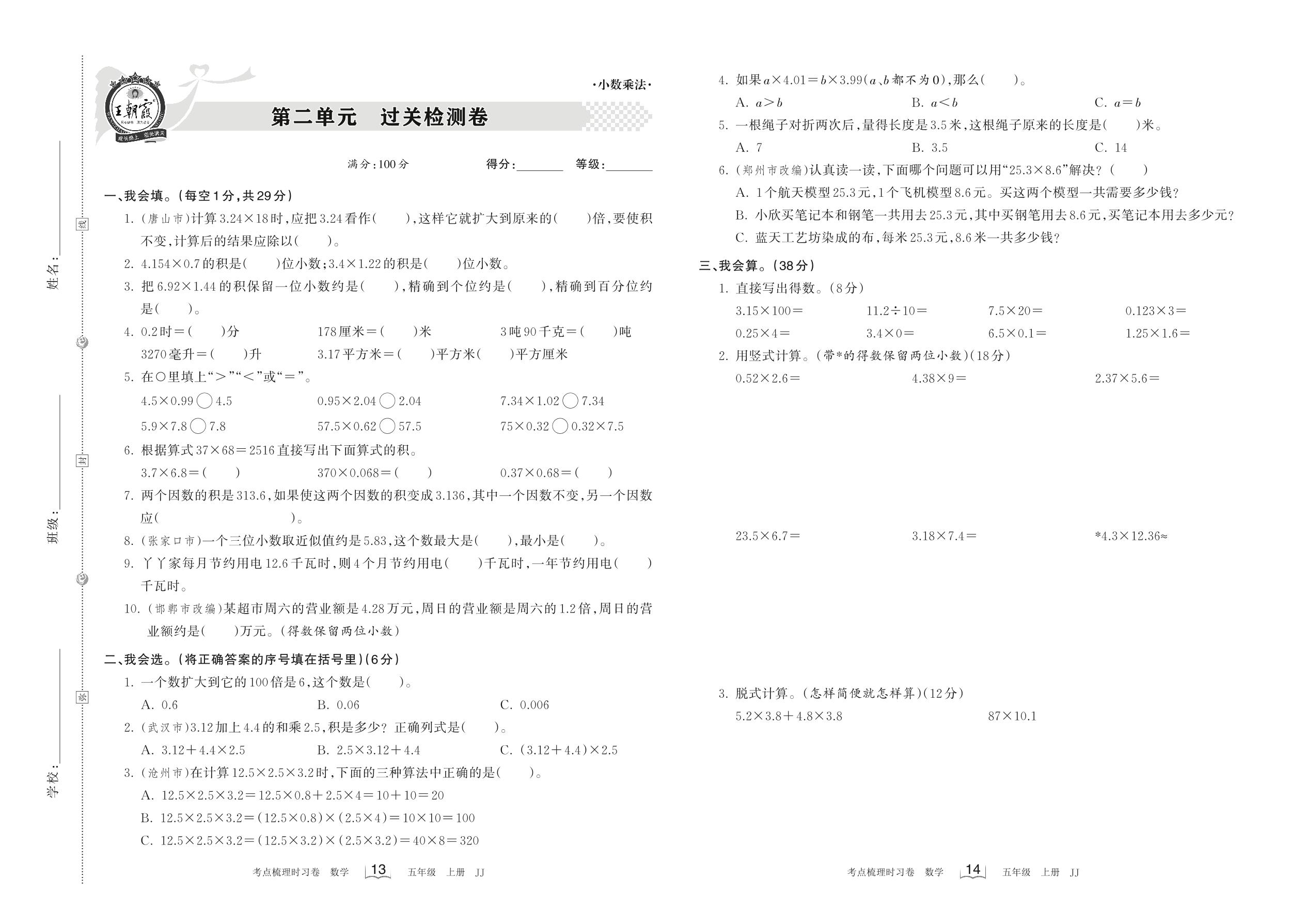2022上册五年级数学冀教版 第二单元 过关检测卷