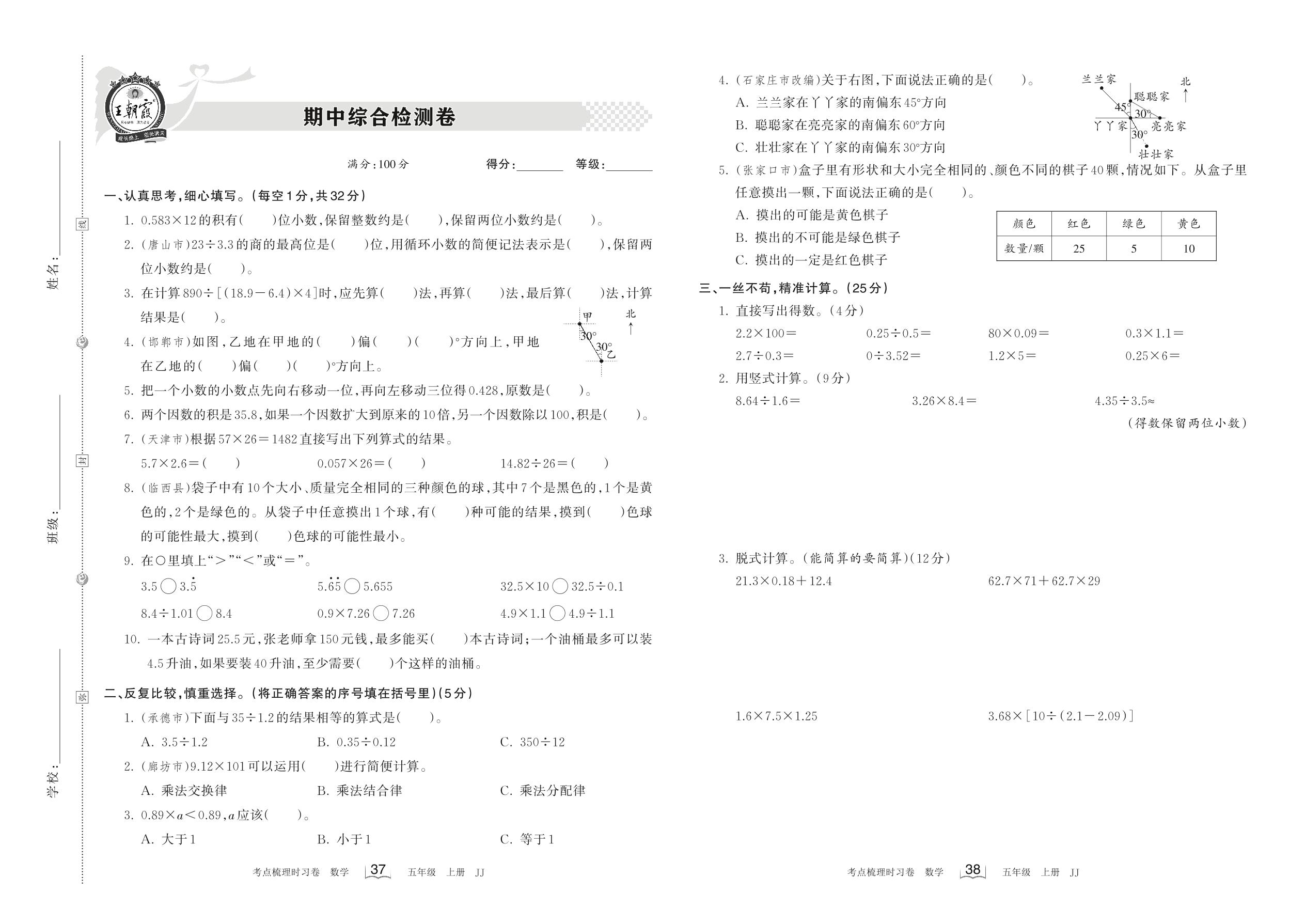 五年级数学冀教版上册期中卷