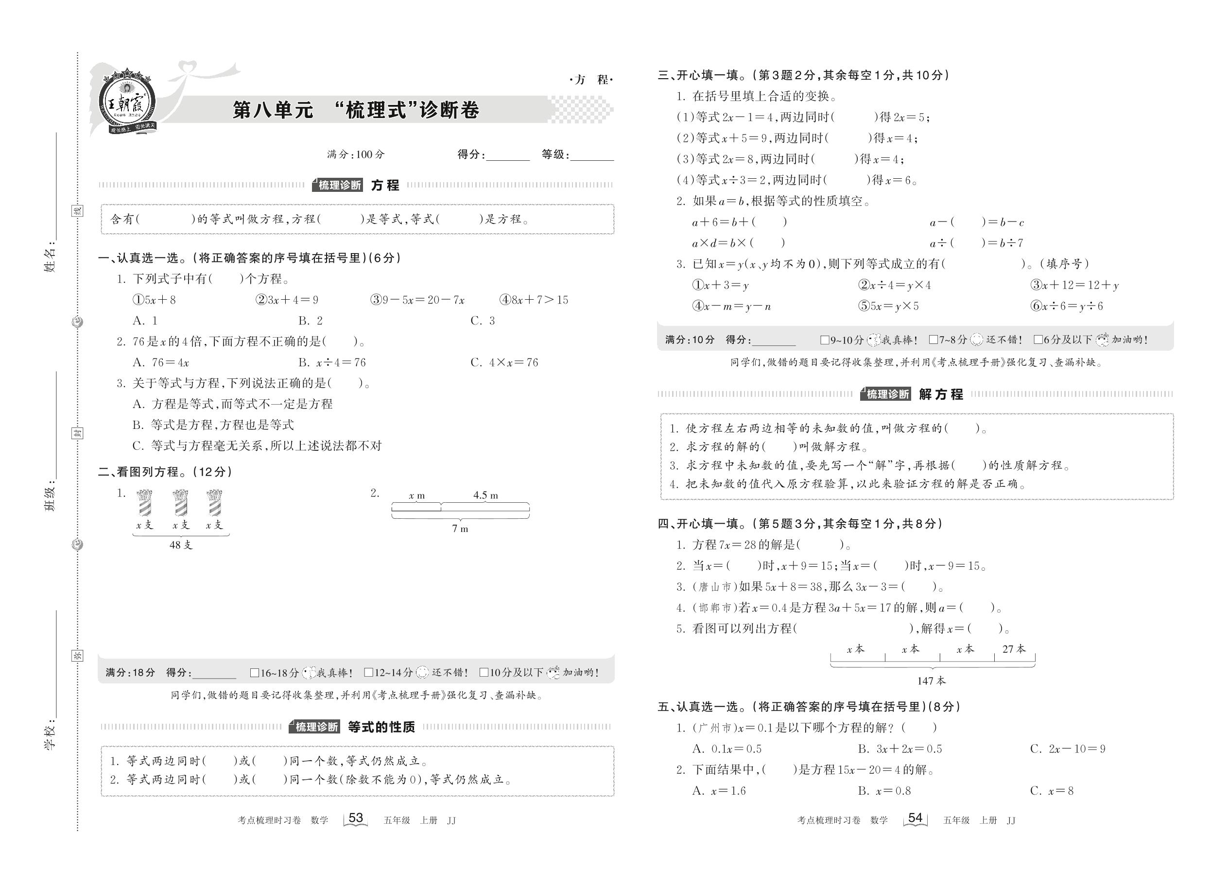 2022上册五年级数学冀教版 第八单元 “梳理式”诊断卷