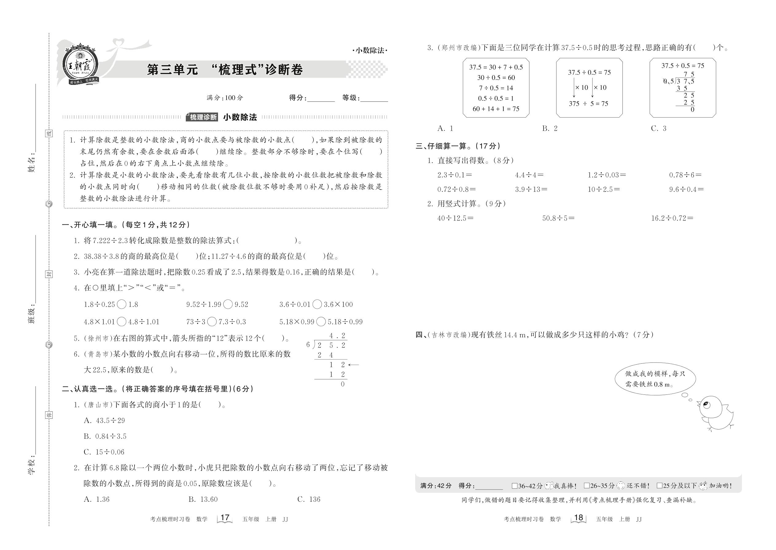 2022上册五年级数学冀教版 第三单元 “梳理式”诊断卷