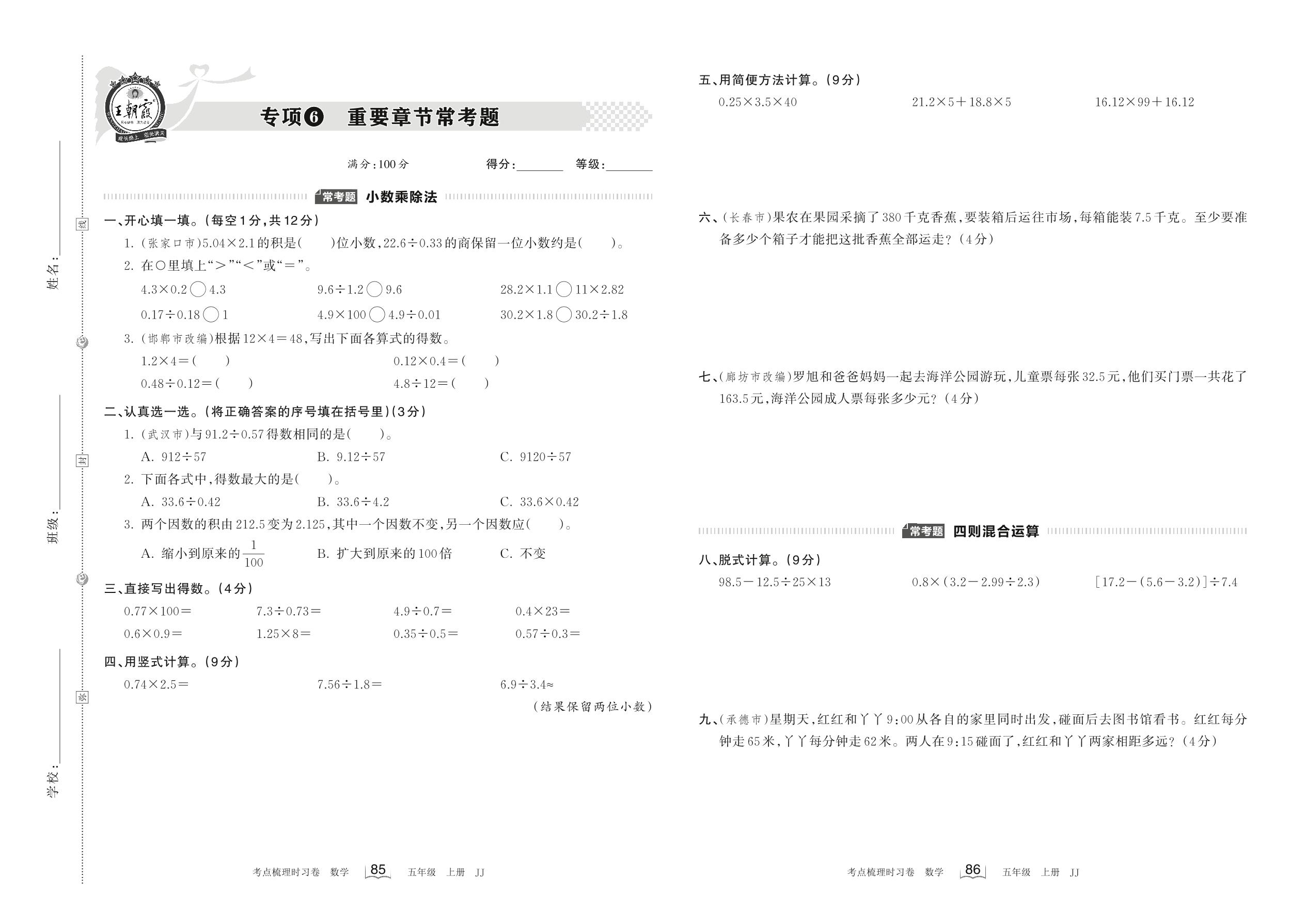 2022上册五年级数学冀教版 专项6 重要章节常考题