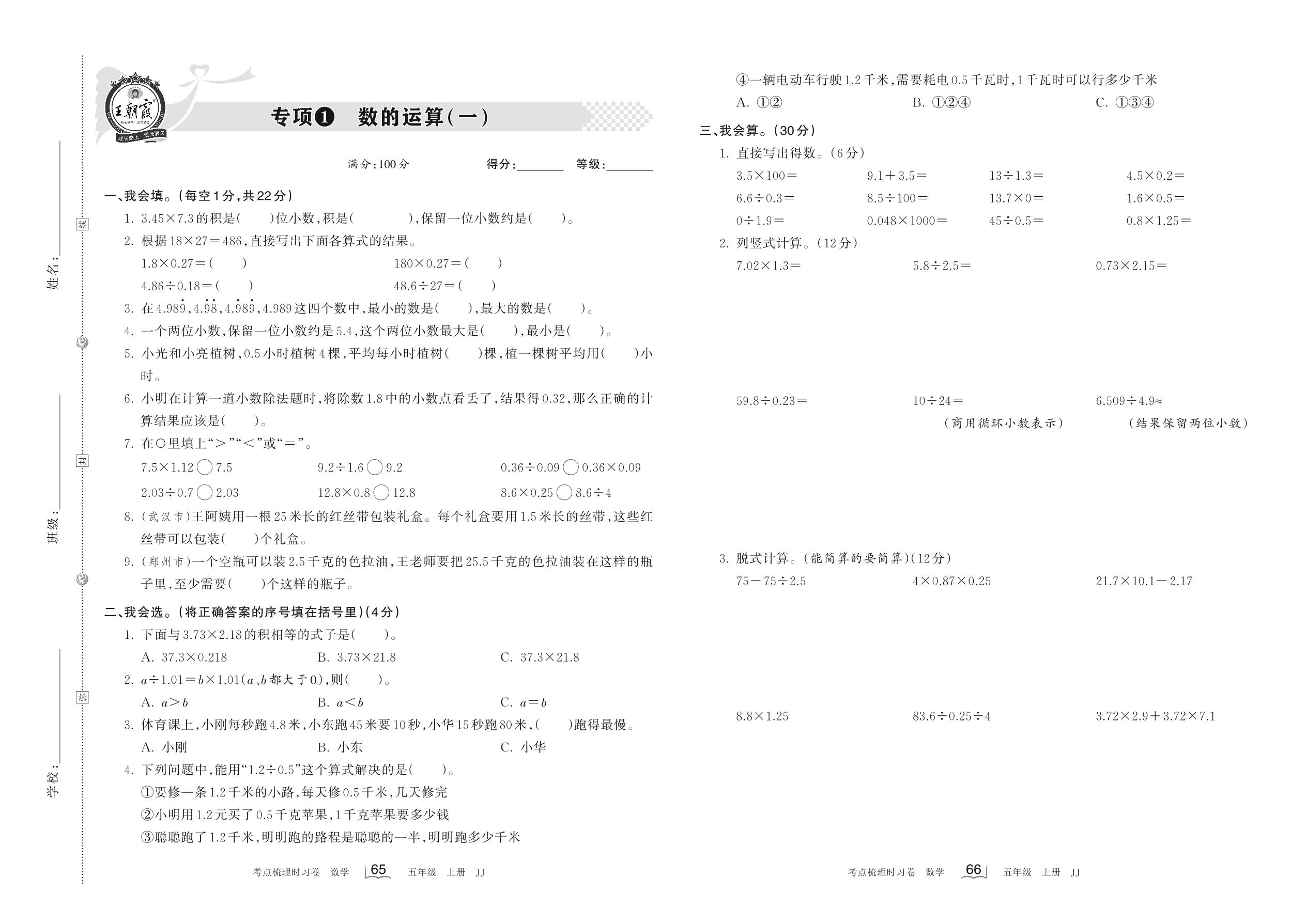 2022上册五年级数学冀教版 专项1 数的运算(一)