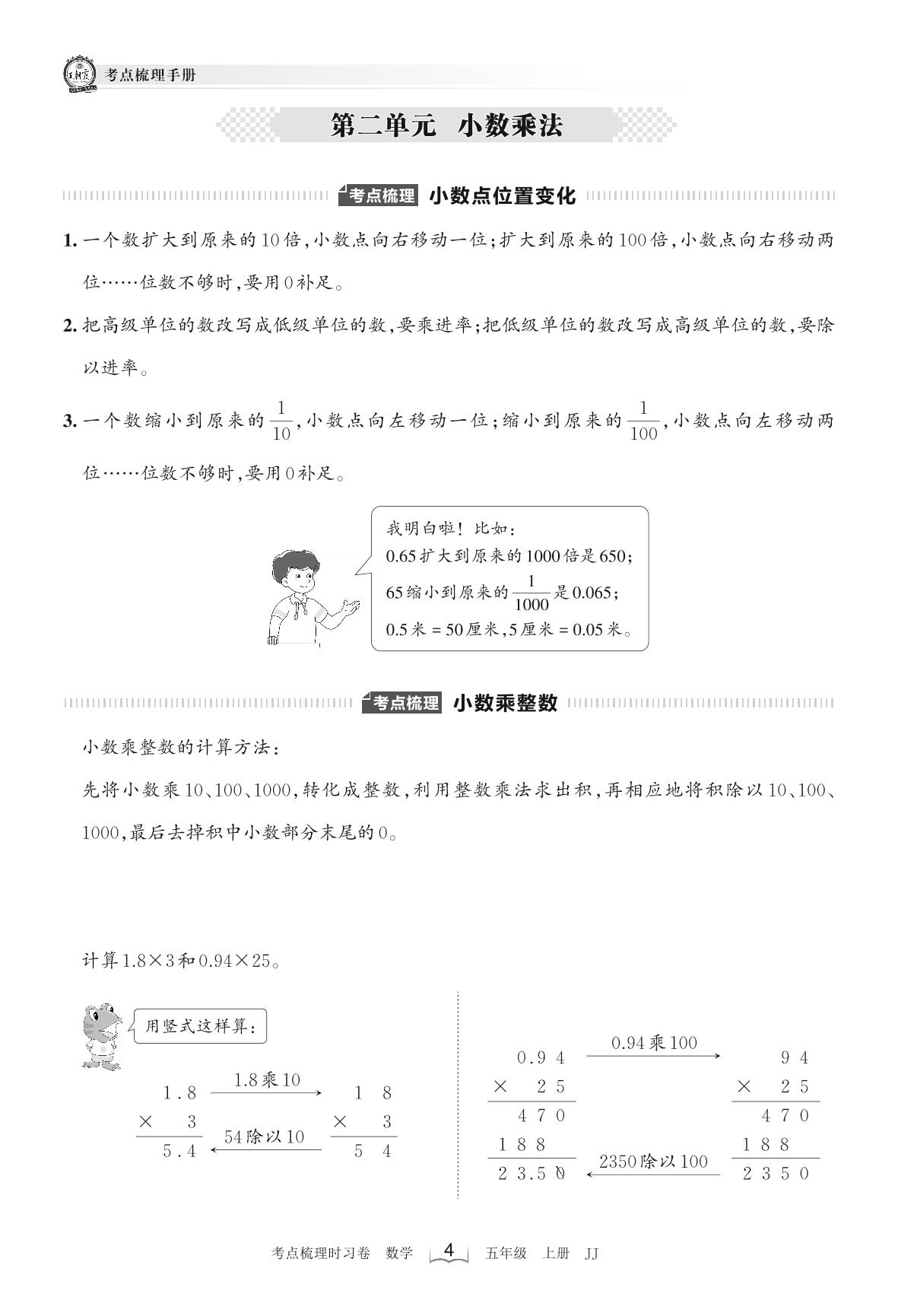 2022上册五年级数学冀教版 考点梳理手册——第二单元 小数乘法