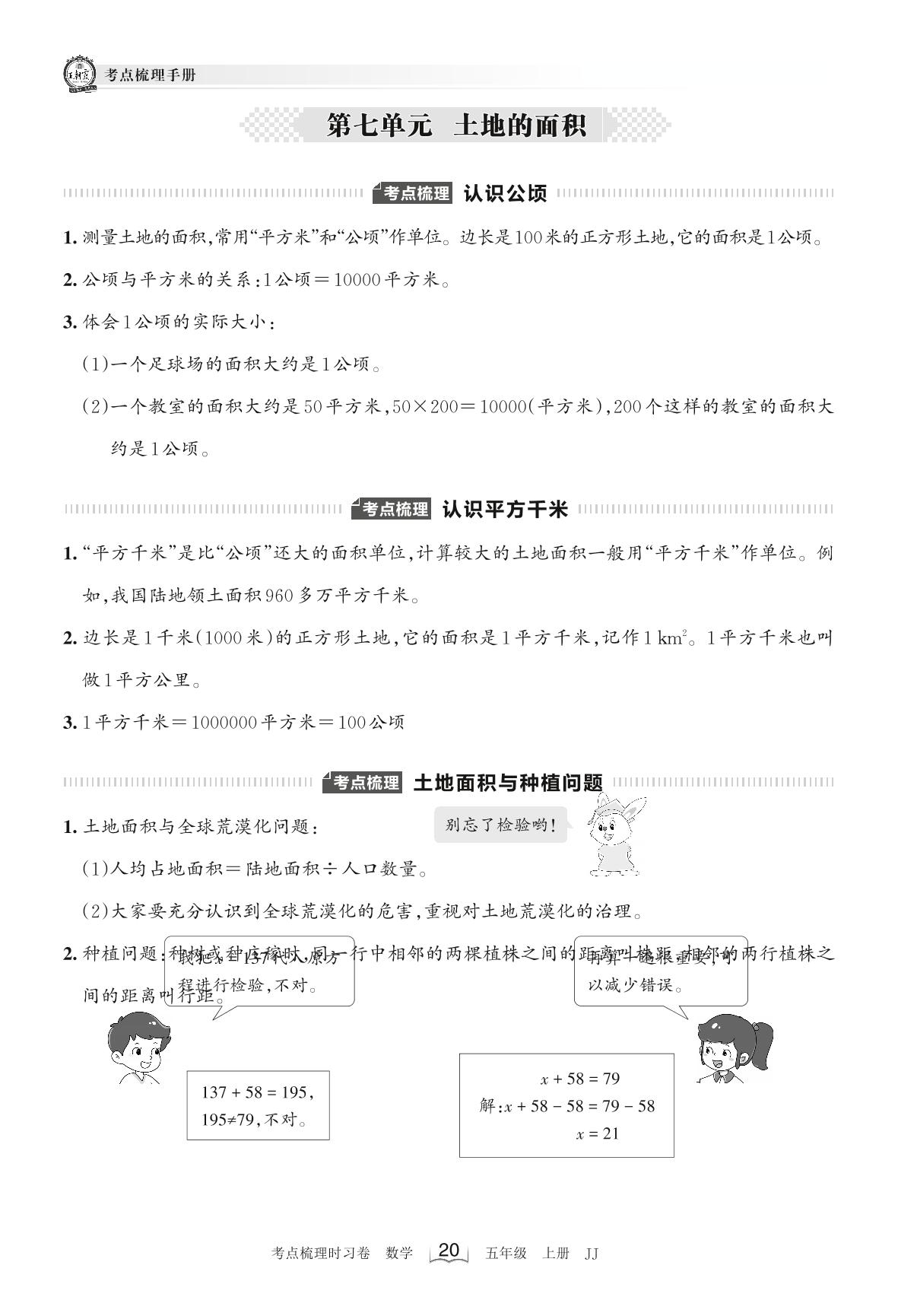 2022上册五年级数学冀教版 考点梳理手册——第七单元 土地的面积