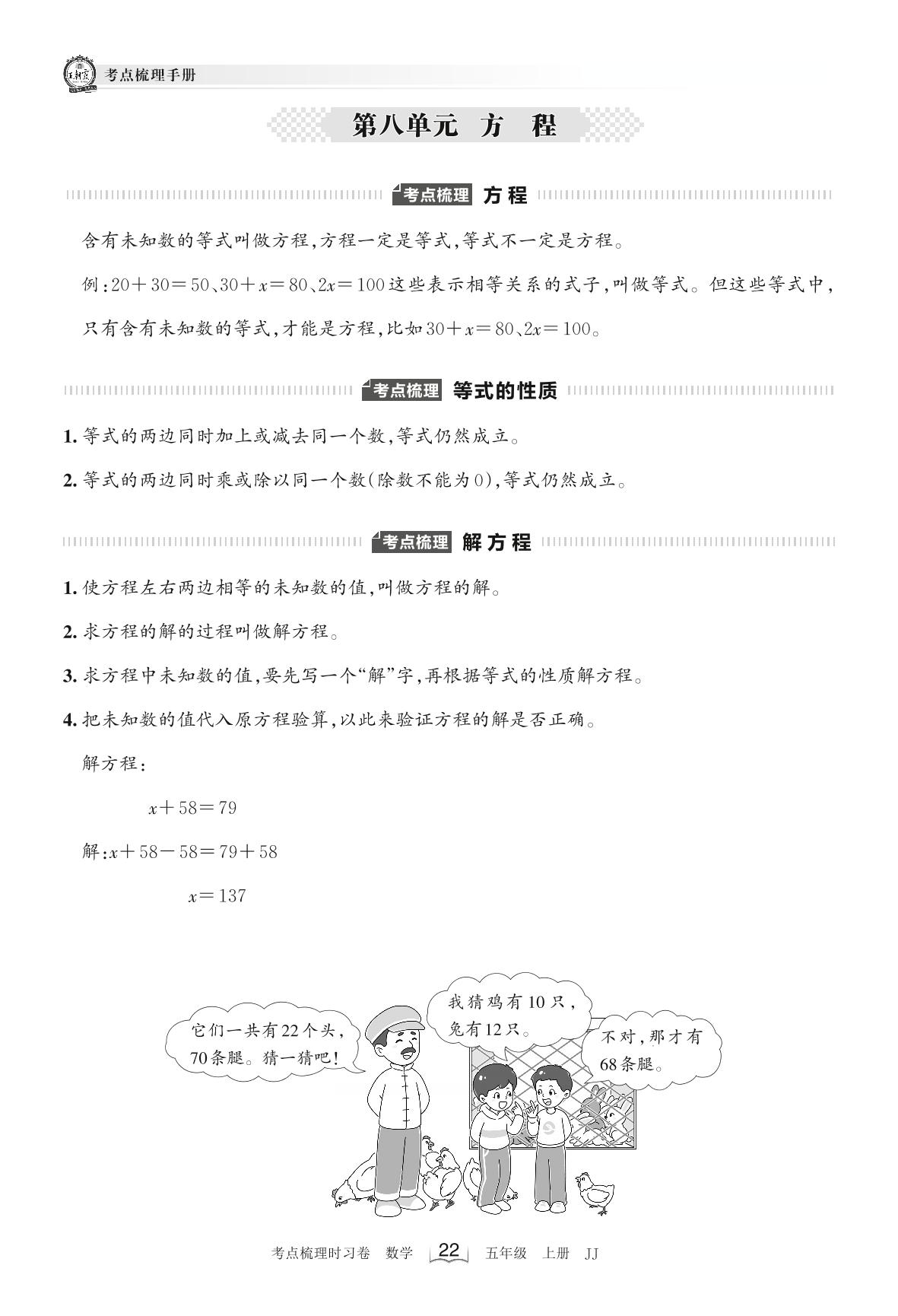 2022上册五年级数学冀教版 考点梳理手册——第八单元 方程