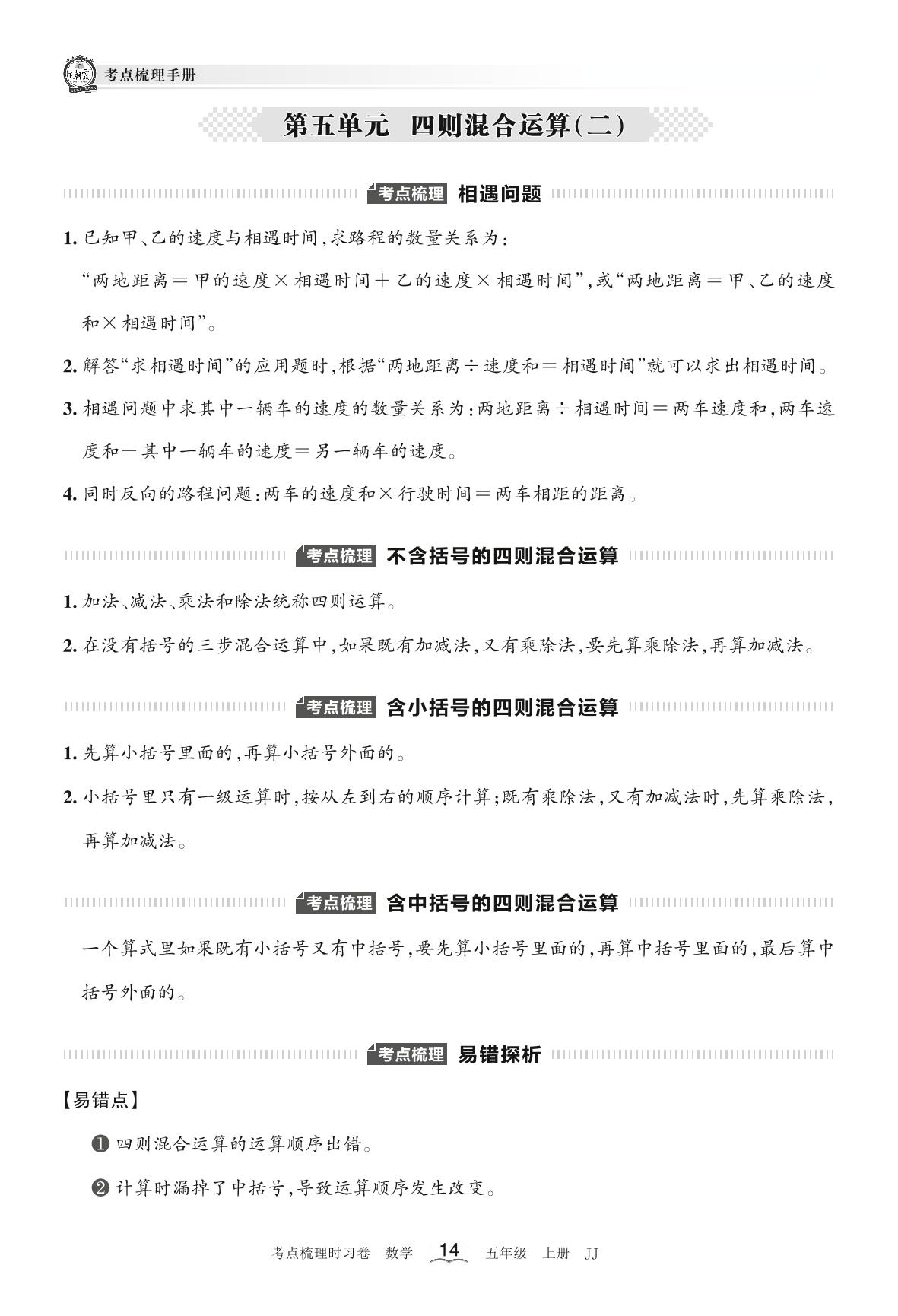 2022上册五年级数学冀教版 考点梳理手册——第五单元 四则混合运算(二)
