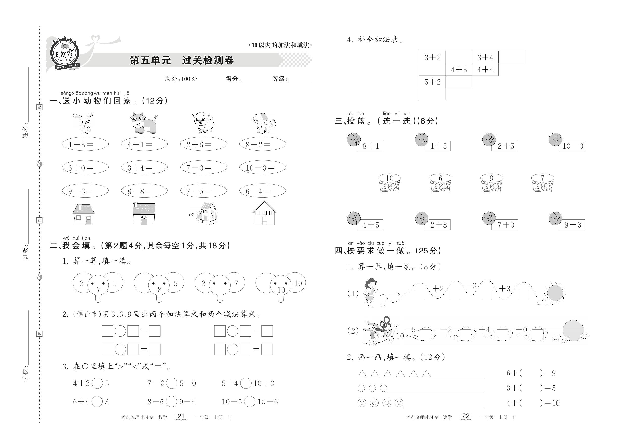 2022上册一年级数学冀教版 第五单元 过关检测卷