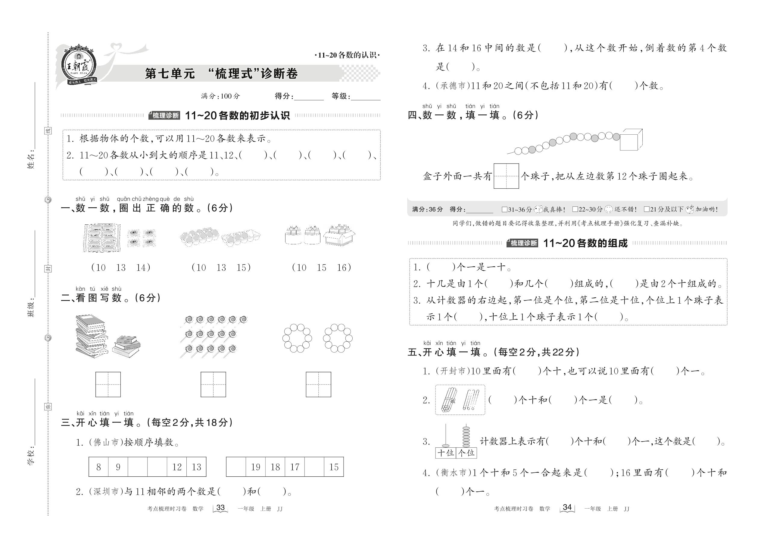 2022上册一年级数学冀教版 第七单元 “梳理式”诊断卷
