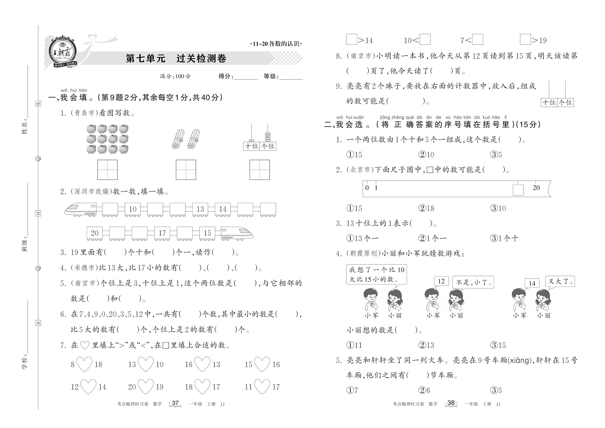 2022上册一年级数学冀教版 第七单元 过关检测卷
