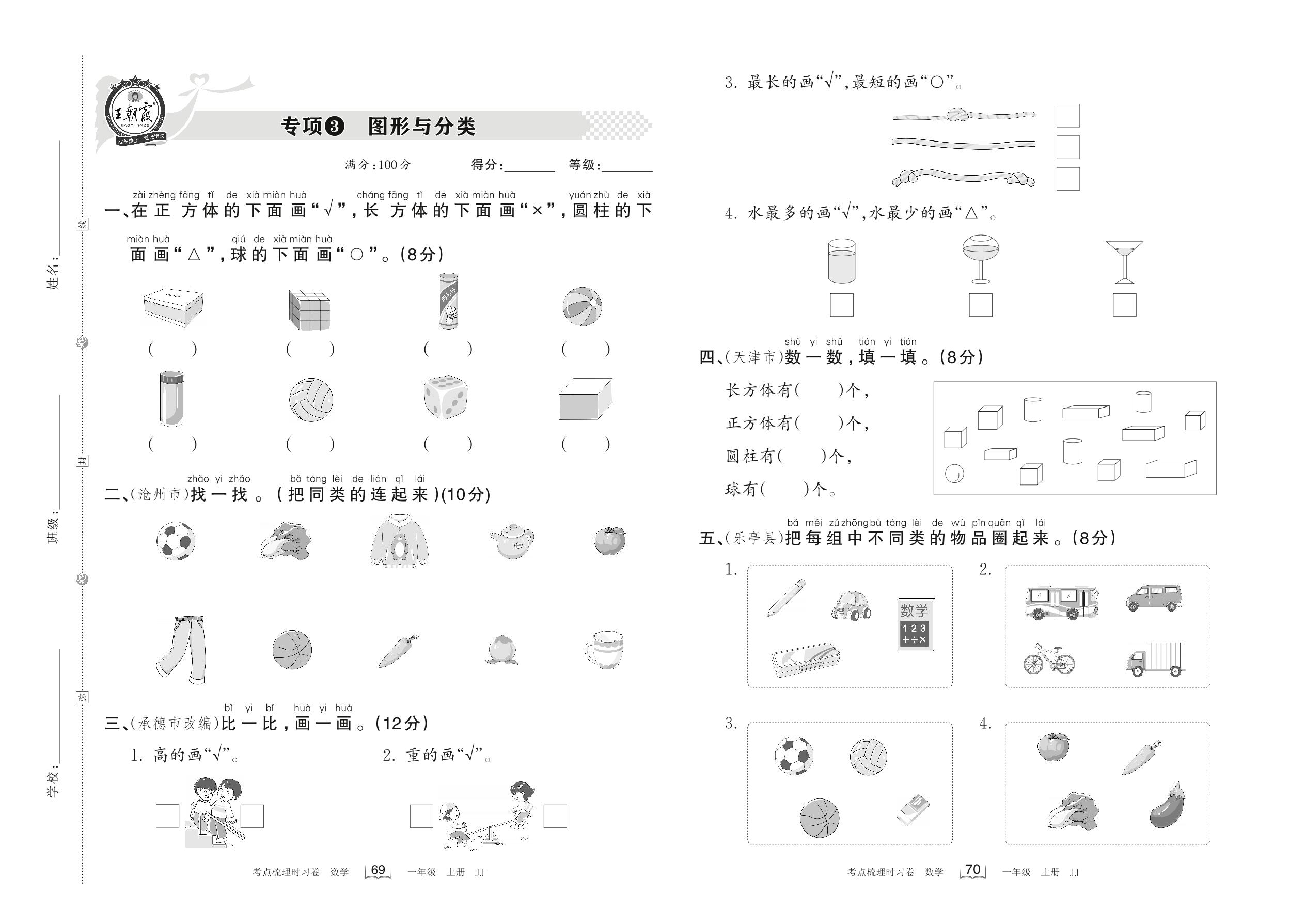 2022上册一年级数学冀教版 专项3 图形与分类