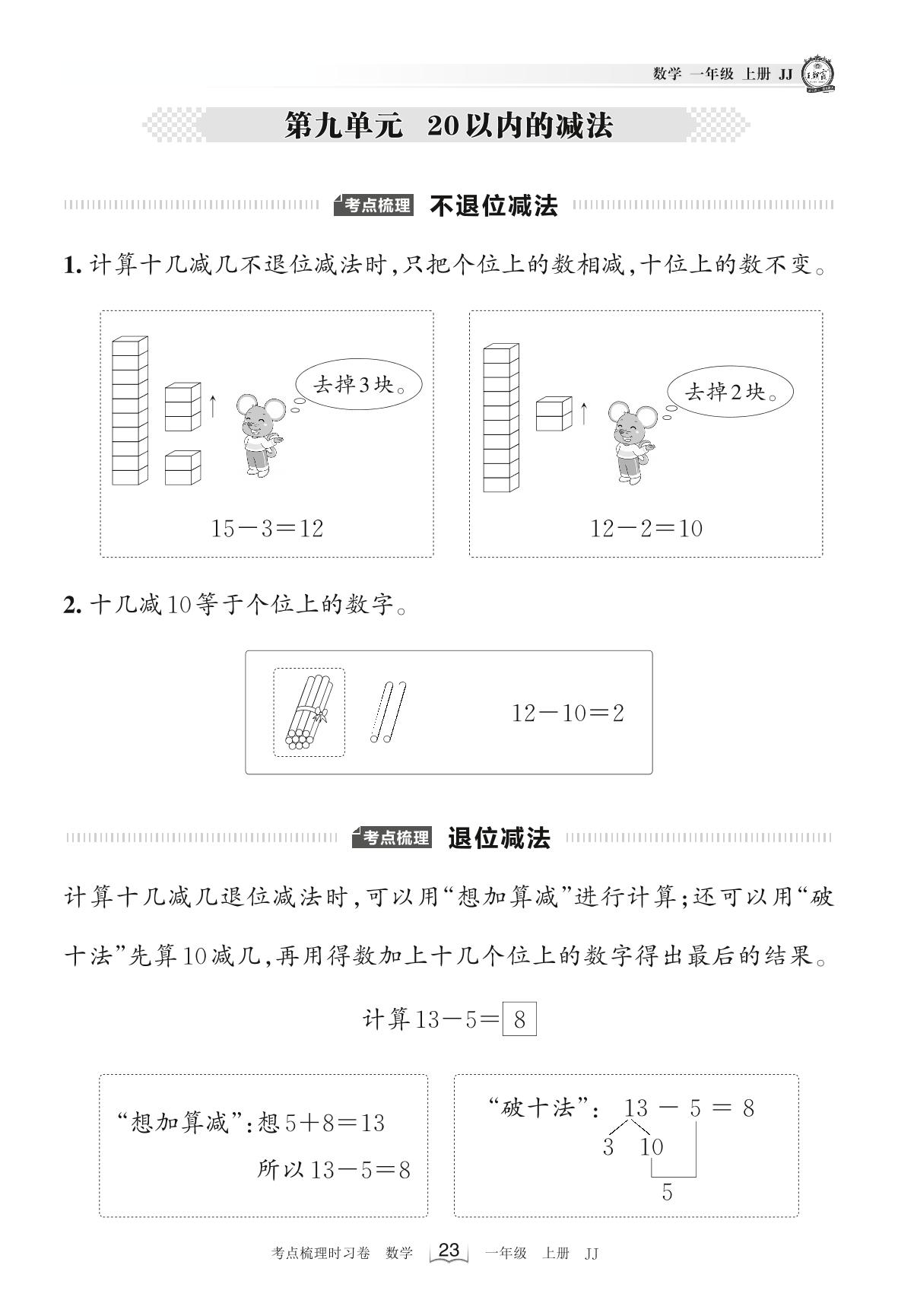 2022上册一年级数学冀教版 考点梳理手册——第九单元 20以内的减法