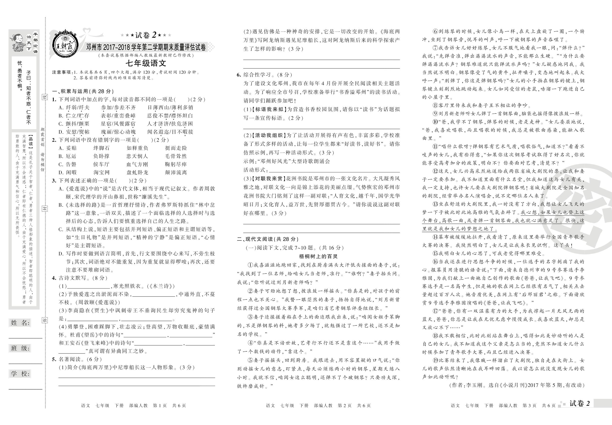 2017-2018学年第二学期邓州市七年级语文试卷(人教版)【2】