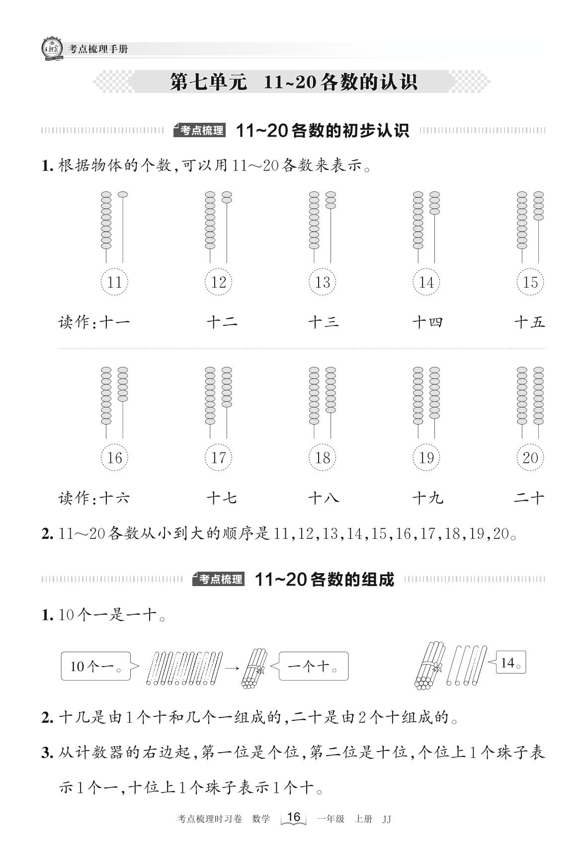 2022上册一年级数学冀教版 考点梳理手册——第七单元 11~20各数的认识