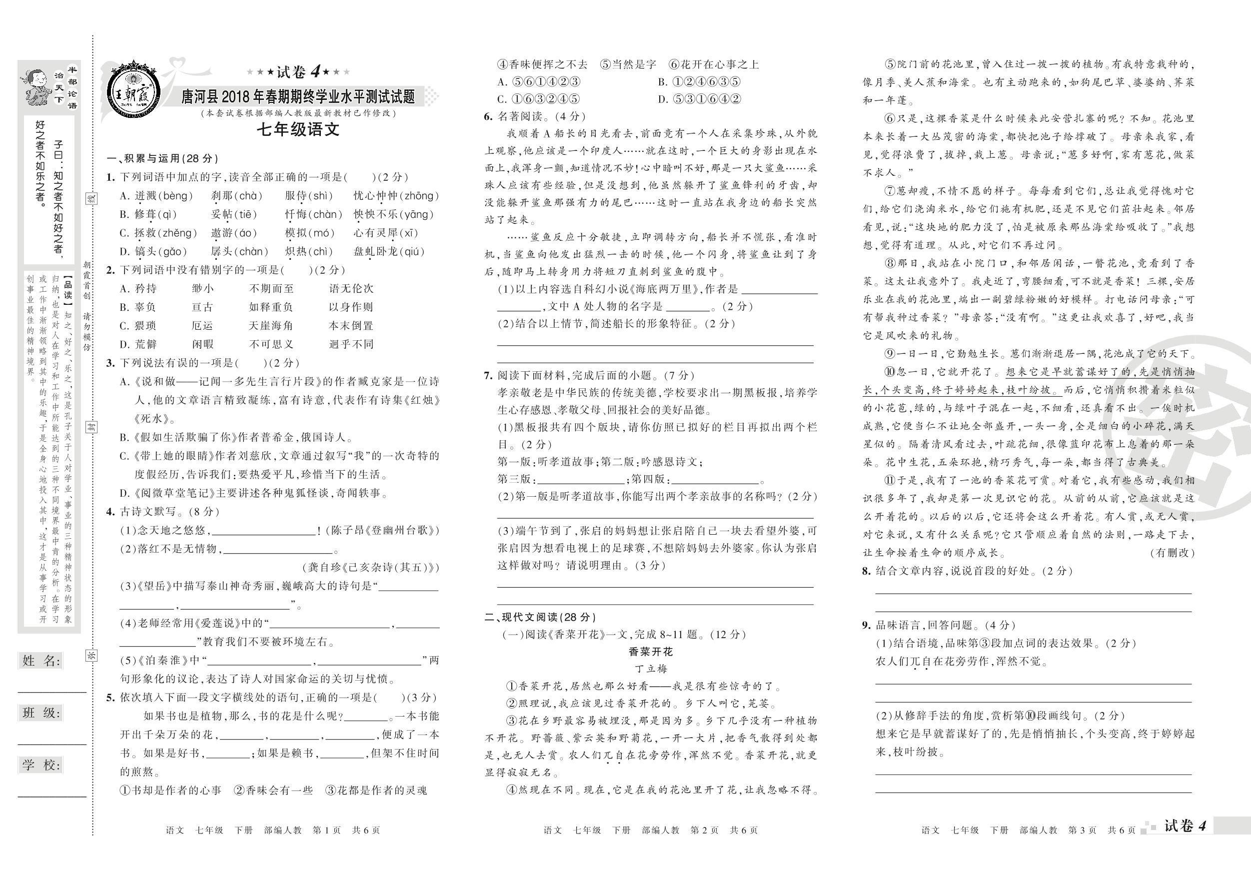 2017-2018学年第二学期南阳市唐河县七年级语文试卷(人教版)【4】